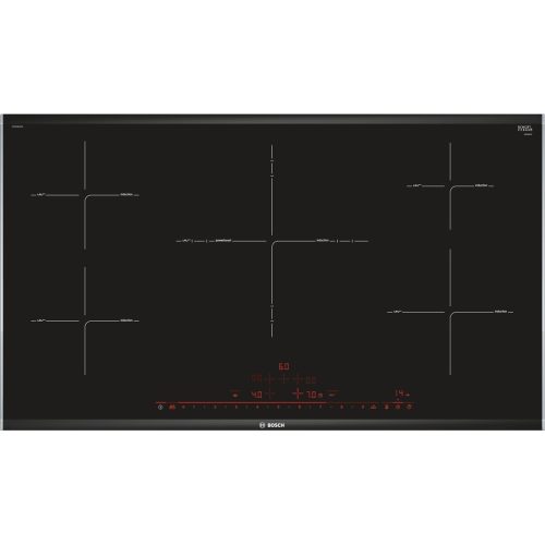 Bosch PIV975DC1E. Colore del prodotto: Nero, Posizionamento dell'apparecchio: Da incasso, Dimensione della larghezza del piano cottura: 90 cm. Tipo di controllo: Touch, Posizione di controllo: Frontale. Potenza aggregata (elettrica): 10800 W. Lunghezza cavo: 1,1 m, Larghezza del compartimento: 56 cm, Profondità di installazione del compartimento (min): 49 cm