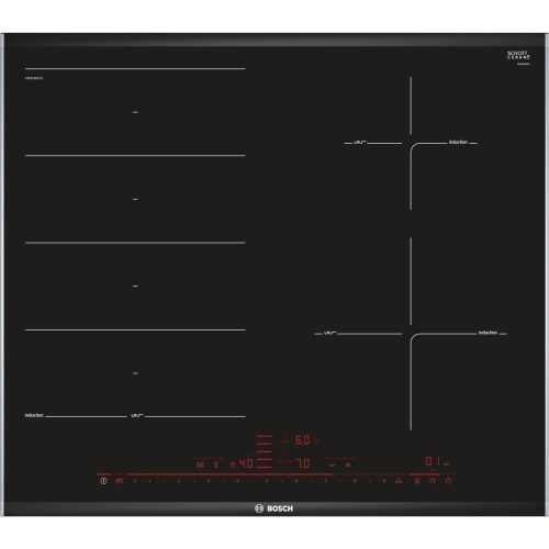 Bosch PXE675DC1E. Colore del prodotto: Nero, Posizionamento dell'apparecchio: Da incasso, Dimensione della larghezza del piano cottura: 60 cm. Tipo di controllo: Touch, Posizione di controllo: Frontale superiore. Potenza aggregata (elettrica): 7400 W. Larghezza: 606 mm, Profondità: 527 mm, Altezza: 51 mm