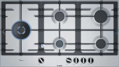 Bosch Serie 6 PCS9A5B90. Colore del prodotto: Acciaio inox, Posizionamento dell'apparecchio: Da incasso, Dimensione della larghezza del piano cottura: 90 cm. Bruciatore piccolo: 1000 W, Bruciatore medio: 1750 W, Bruciatore grande: 3000 W. Tipo di controllo: Manopola, Posizione di controllo: Frontale. Potenza aggregata (elettrica): 1 W, Potenza aggregata (gas): 12500…