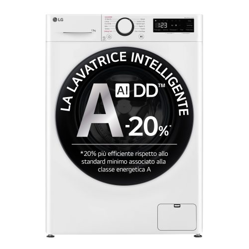 LG F4R3013NSWB Lavatrice 13kg AI DD, Classe A-20%, 1400 giri, Lavaggio a vapore. Tipo di carica: Caricamento frontale. Capacità cestello: 13 kg, Classe di efficienza della centrifuga: A, Silenziosità (centrifuga): 72 dB, Velocità di centrifuga massima: 1400 Giri/min. Colore del prodotto: Bianco. Larghezza: 600 mm, Profondità: 615 mm, Altezza: 850…