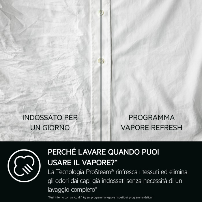 Il vapore rinfresca rapidamente i tessuti ed elimina gli odori dai capi già indossati, consumando solo 2L d’acqua per ciclo. Aggiungendo invece l’opzione Vapore Finale al termine di un ciclo di lavaggio, puoi ridurre le pieghe e il tempo di stiratura.