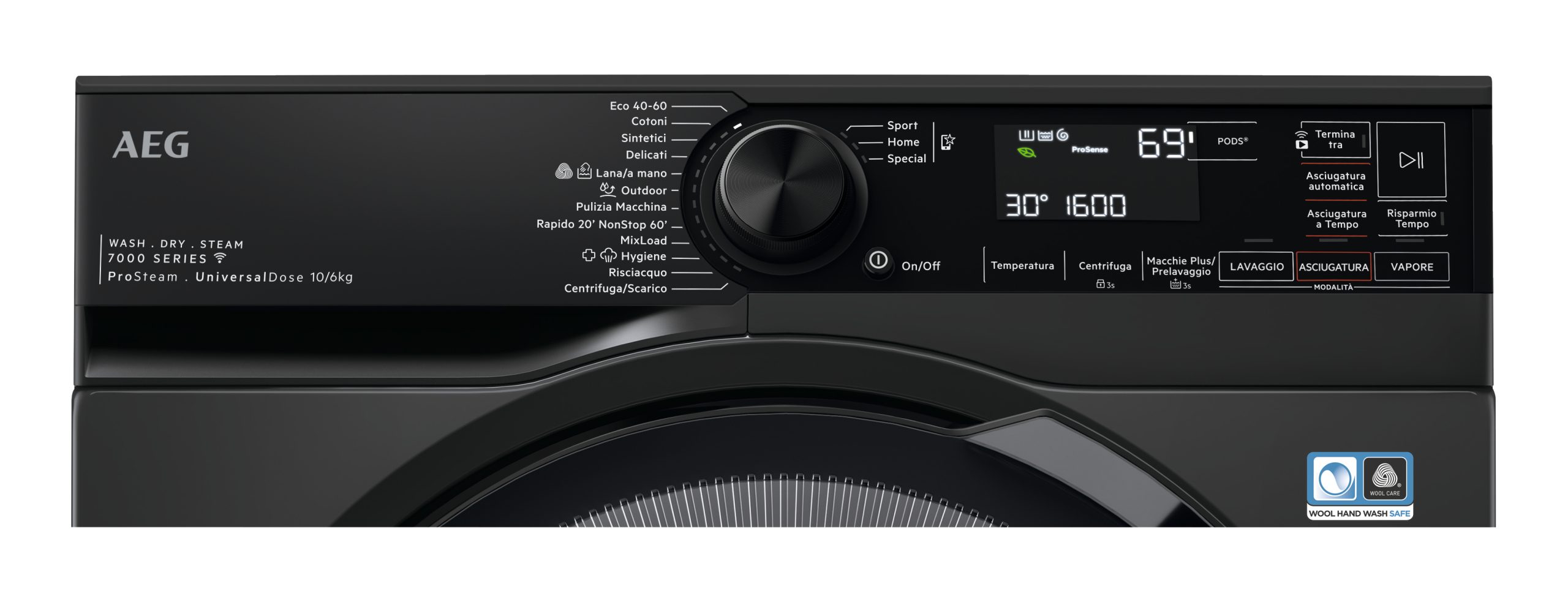 Programmi di lavaggio Cotone, Delicati/Seta, Eco, Igiene/Allergy Care, Mix, Esterno, Prelavaggio, Rapido, Risciacquo, Centrifuga/scarico, Vapore, Sintetico, Lana Cotone, Delicati/Seta, Eco, Igiene/Allergy Care, Esterno, Rapido, Risciacquo, Centrifuga/scarico, Vapore, Sintetico, Lana Delicati/Seta, Eco 40-60°C, Esterno, Prelavaggio, Rapido, Risciacquo, A tamburo, Centrifuga/scarico, Stain care, Vapore, Sintetico, Lana