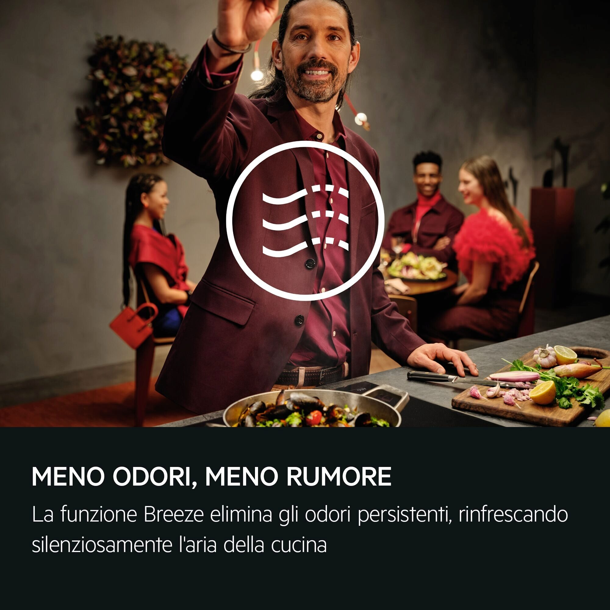 Grazie all’avanzata tecnologia dei sensori, la cappa 9000 AutoSense rileva in modo intuitivo vapore, grasso e odori regolando automaticamente la potenza della ventola per pulire l’aria. Cucina con la famiglia e gli amici in un ambiente fresco e meno rumoroso.