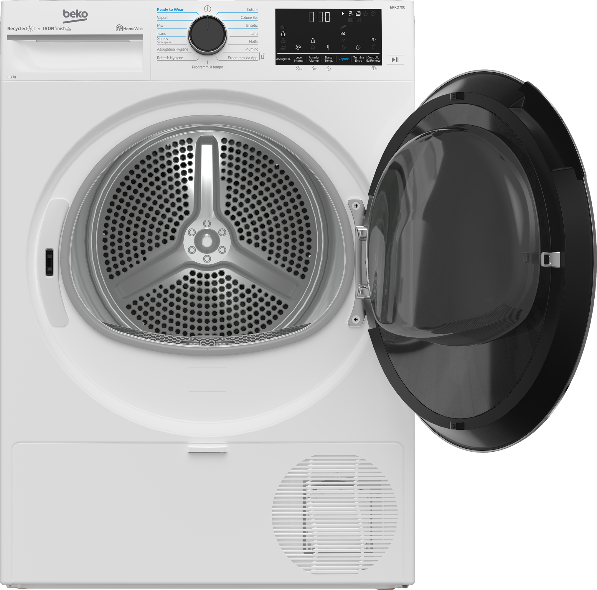 | Programmi di asciugatura | Cotone, Jeans/denim, Hygienic drying, Piumino/piumone, Lana, Mix, Silent, 50min, Vapore, Ready to wear, Hygienic freshen-up, Cotton eco, Sintetico, Programmato, Download cycle | Cura del bambino, Cotone, Cotton eco, Piumino/piumone, Ferro da stiro a secco, Jeans/denim, Mix, Rapido, Refresh, Silent, Sintetico, Lana | Camicia/maglietta, Cotone, Cotton iron dry, Delicati/Seta, Piumino/piumone, Eco, Risciacquo, Jeans/denim, Mix, Rapido, Silent, Sport, Sintetico, Riscaldamento, Lana |