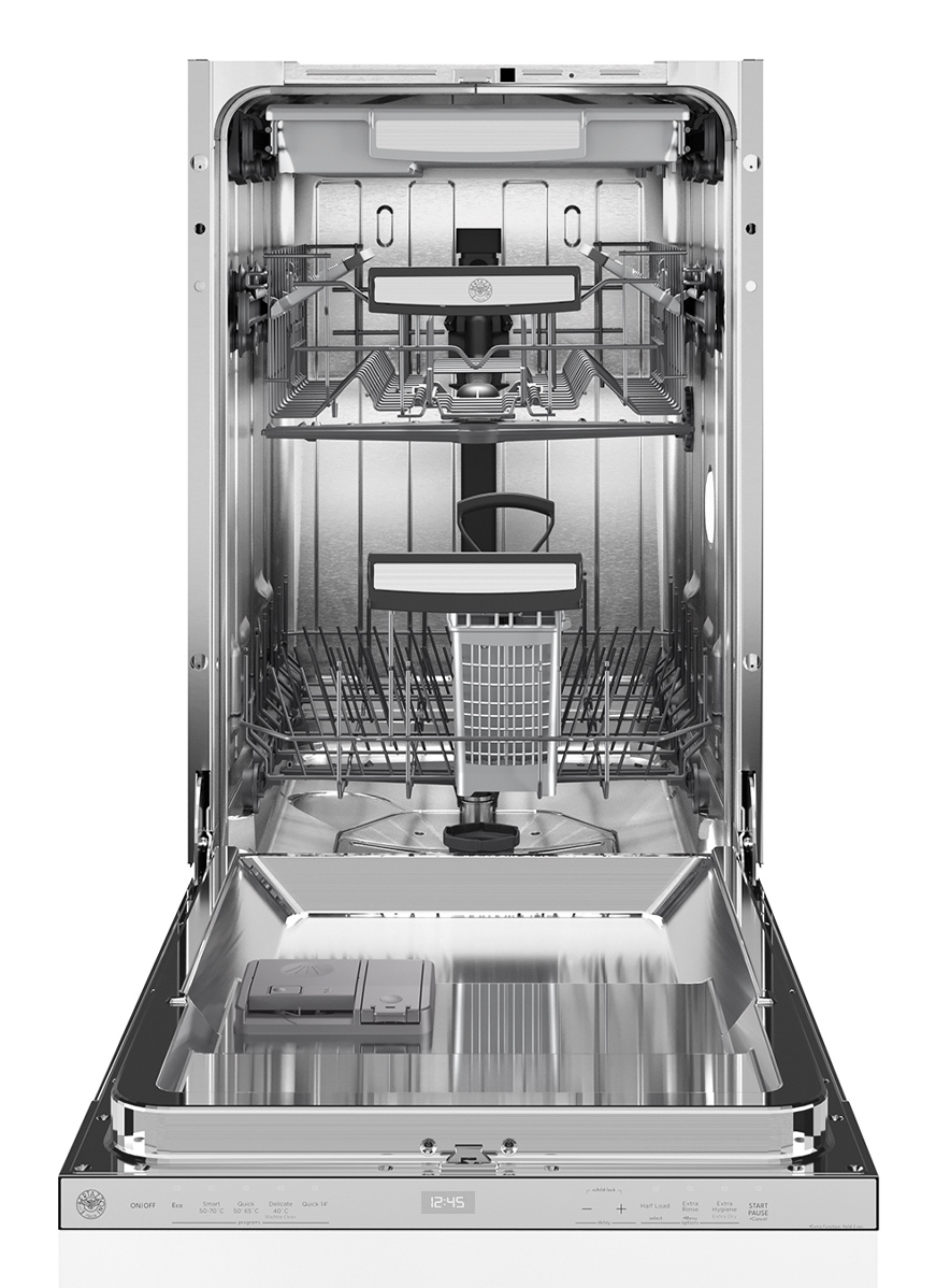 Bertazzoni DW45S3IEPDC. Posizionamento dell’apparecchio: A scomparsa totale, Dimensione: Compatta (45 cm), Tipo di display: LED. Numero di coperti: 10 coperti, Classe emissione rumore: C, Emissione acustica: 45 dB. Classe efficienza energetica: E, Consumo di acqua per ciclo: 9 L, Consumo energetico per 100 cicli: 76 kWh. Larghezza: 448 mm, Profondità: 550 mm, Altezza: 647 mm