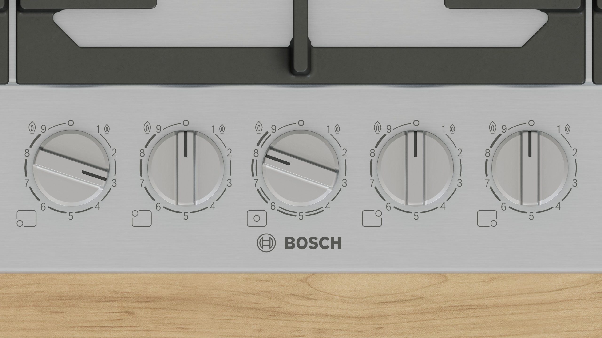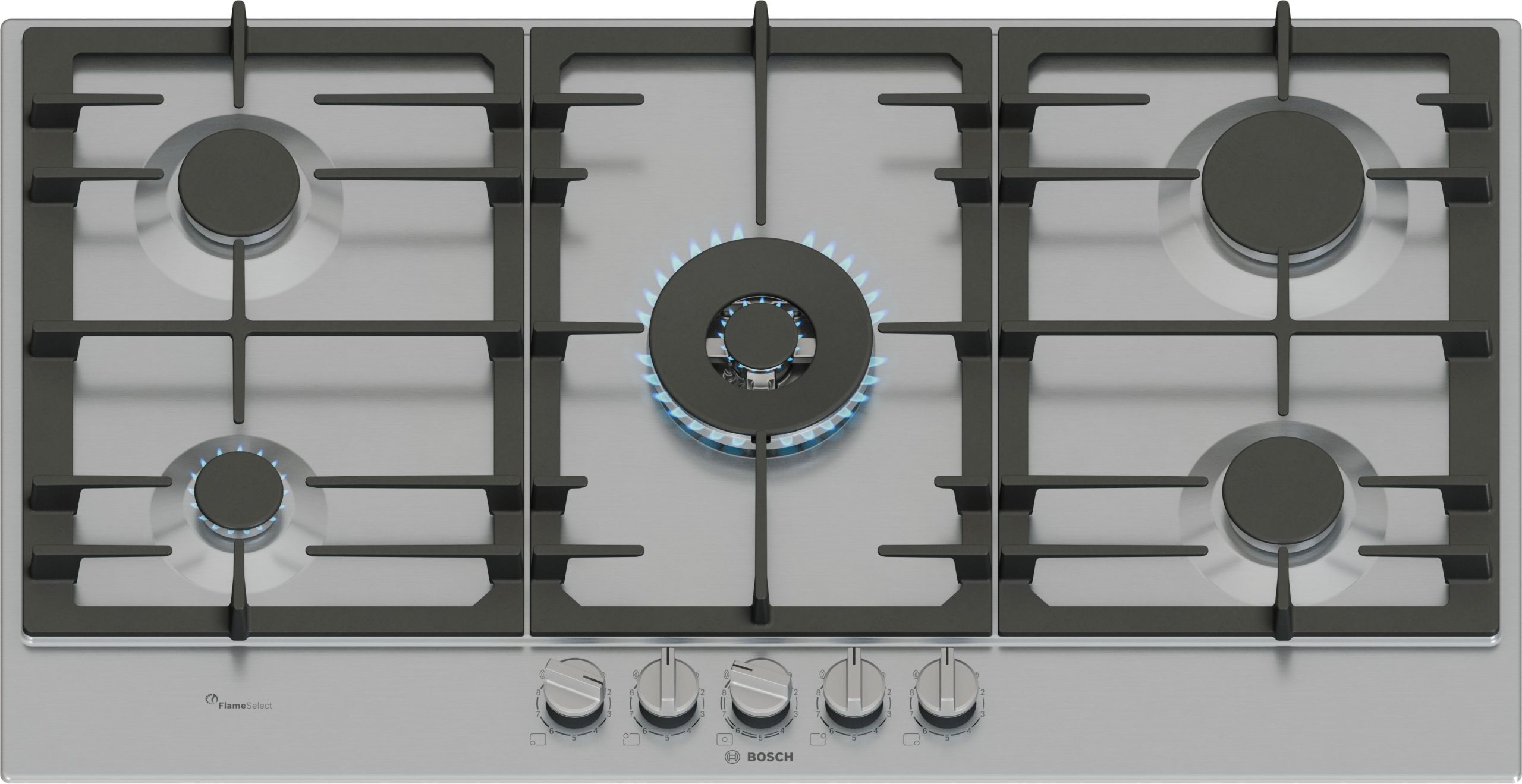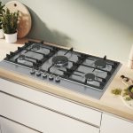 Piano cottura a gas con controllo preciso della fiamma Flame Select e facile pulizia grazie alle manopole magnetiche removibili e alle griglie in ghisa lavabili in lavastoviglie.