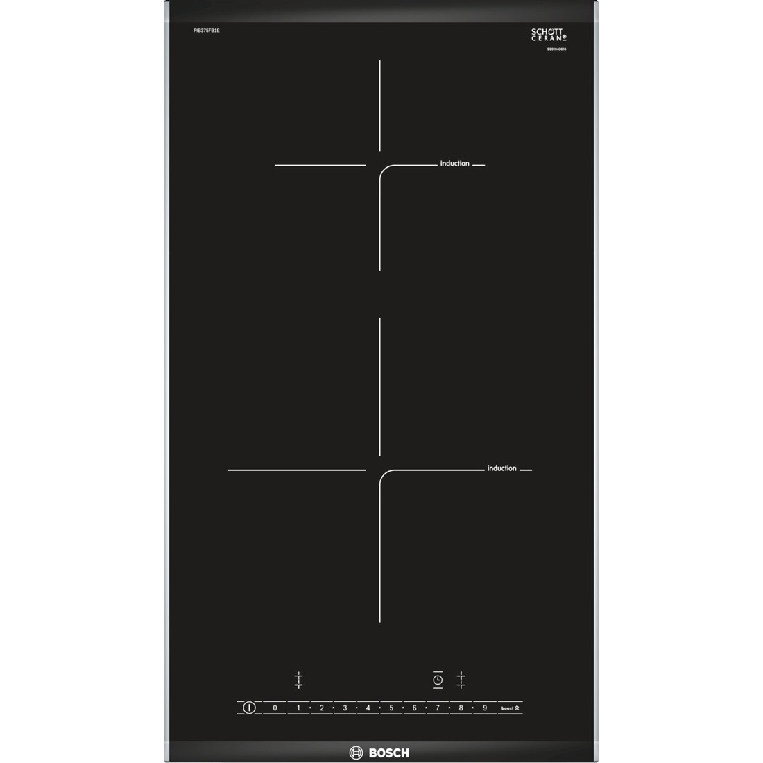Bosch PIB375FB1E. Colore del prodotto: Nero, Acciaio inox, Posizionamento dell’apparecchio: Da incasso, Tipo di piano cottura: Piano cottura a induzione. Tipo di controllo: Touch, Posizione di controllo: Frontale superiore. Potenza aggregata (elettrica): 3700 W, Tensione di ingresso AC: 220-240 V, Frequenza di ingresso AC: 50 – 60 Hz. Larghezza: 306 mm, Profondità: 527 mm, Altezza: 51 mm