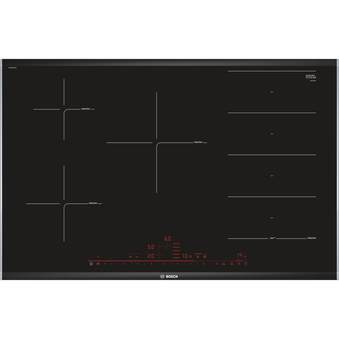 Bosch Serie 8 PXV875DC1E. Colore del prodotto: Nero, Posizionamento dell’apparecchio: Da incasso, Dimensione della larghezza del piano cottura: 80 cm. Certificazione: AENOR, CE. Tipo di controllo: Touch, Posizione di controllo: Frontale superiore. Potenza aggregata (elettrica): 7400 W, Tensione di ingresso AC: 220-240 V, Frequenza di ingresso AC: 50 – 60 Hz. Larghezza: 816 mm, Profondità: 527 mm, Altezza: 51 mm