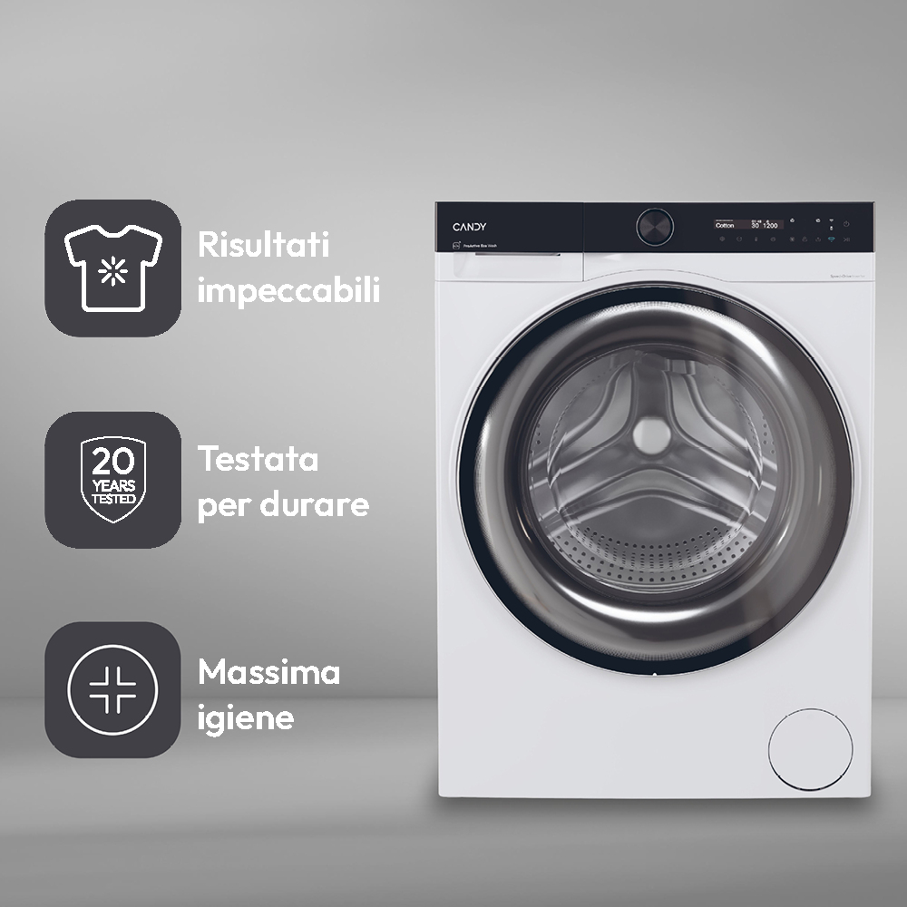 Nata per essere pronta a qualsiasi sfida di lavaggio, la lavatrice Candy ProWash 700 lava rapidamente i tuoi indumenti con il minimo consumo di energia e acqua, grazie alla funzione ProActive EcoWash, in un cestello XL sempre pulito. Estremamente silenziosa e intuitiva grazie al display LCD. ProWash 700 insieme all’app hOn, è progettata per trasformare il tuo bucato nell’esperienza più piacevole di sempre.