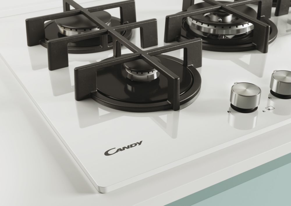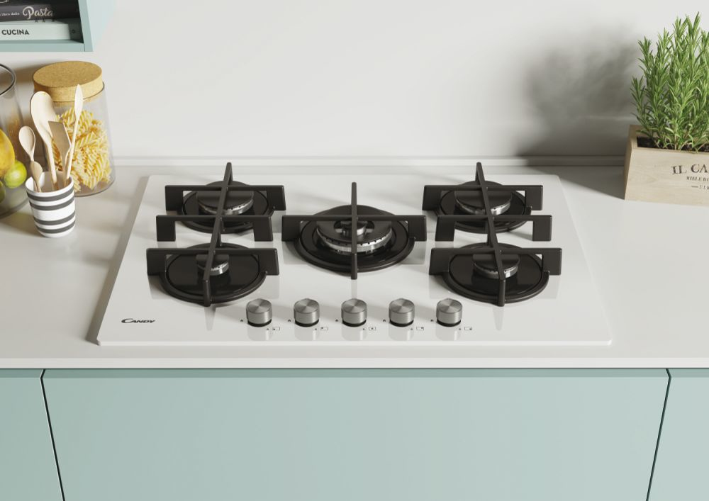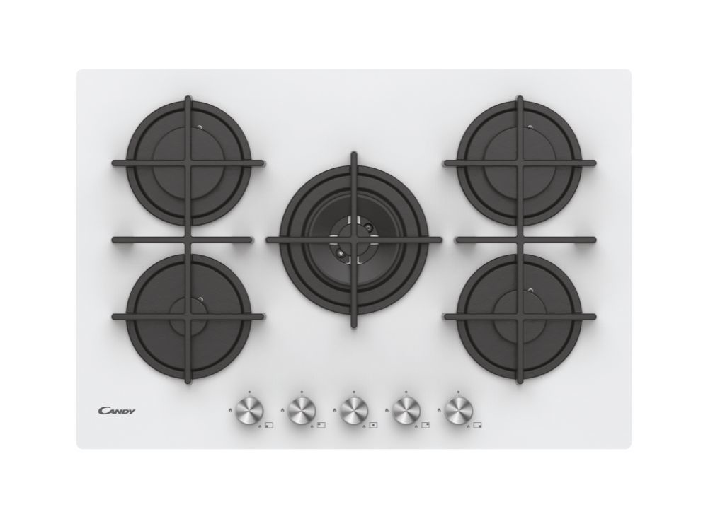 Candy CVG74WPW Piano Cottura Gas Piano da 75 cm – 5 Fuochi – New Timeless GOG Bianco – manopole New Timeless – Bruciatore speciale al centro DC 4 Kw – Griglie in ghisa –