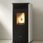 Stufa a pellet con top con profili in ceramica, rivestimento acciaio verniciato, aria comburente preriscaldata 3 ventilatori tangenziali, braciere in ghisa con post combustione, cassetto cenere estraibile porta in ghisa interamente verniciata, telecomando e maniglia estraibile.