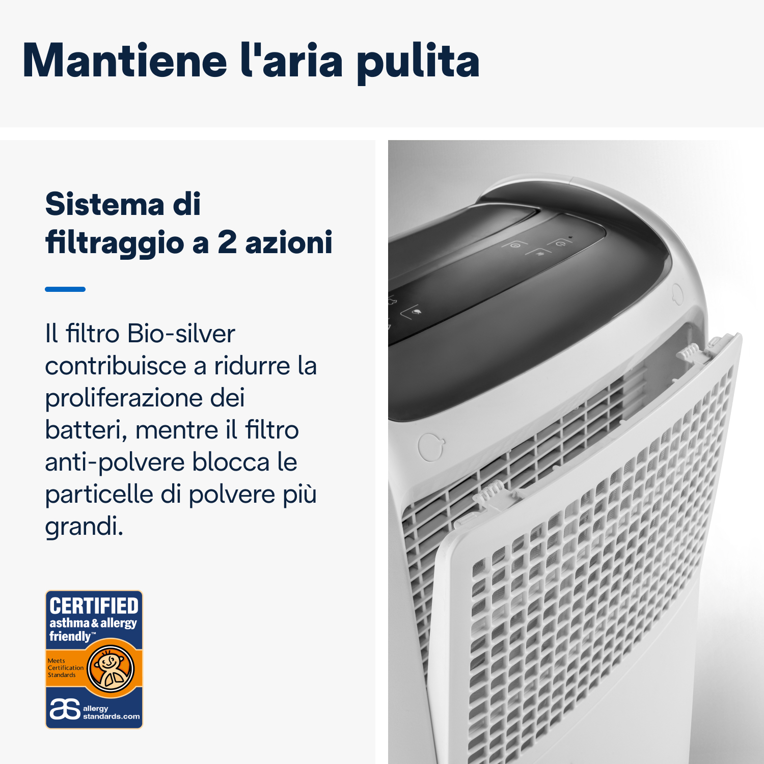 Il filtro Bio Silver migliora la qualità dell’aria, grazie ad un agente antisettico riduce efficacemente batteri e allergeni e, allo stesso tempo, rimuove l’umidità in eccesso.