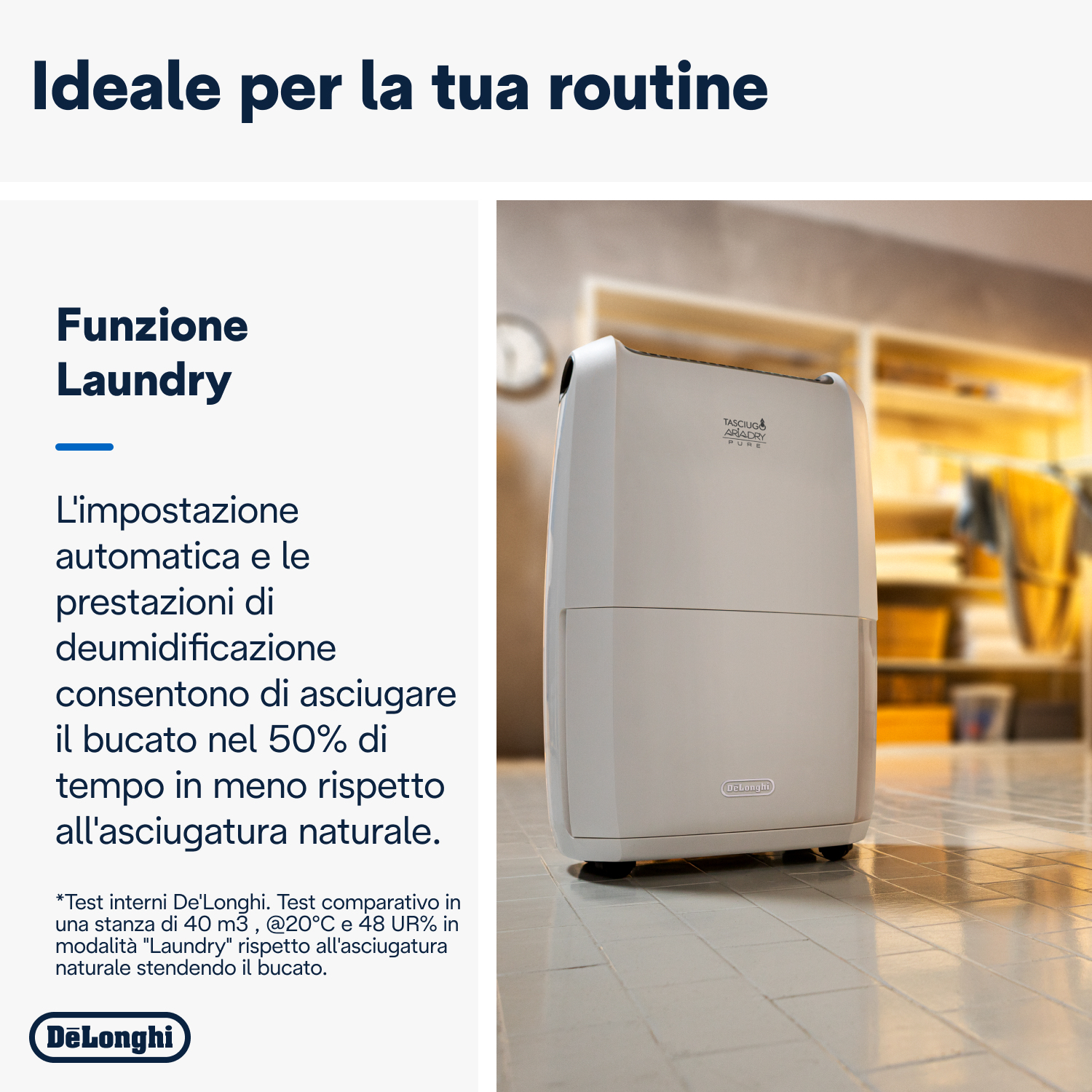 Il deumidificatore funziona ininterrottamente al massimo della sua capacità per assicurare l’asciugatura rapida della biancheria.