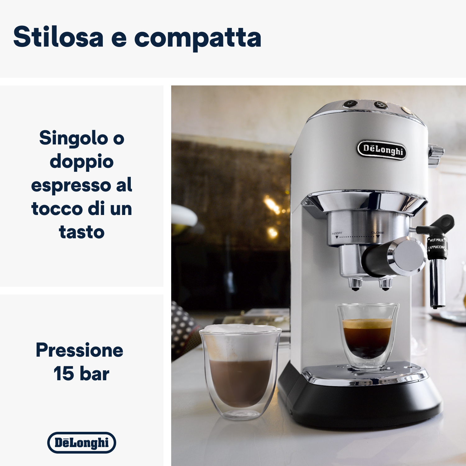 Macchina da caffè espresso De’Longhi, per l’espresso italiano tradizionale come quello del bar. Utilizza il caffè in polvere o le cialde E.S.E. che si alloggiano perfettamente nello speciale portafiltro. Si tratta della classica macchinetta da caffè con braccetto professionale e con la possibilità di montare il latte per un ottimo cappuccino.