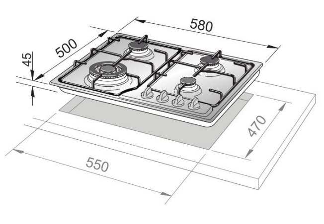 Piano con estetica inox a 4 bruciatori, valvolatura di sicurezza ed accensione elettronica, offrono uno livello che va oltre le dimensioni del piano.