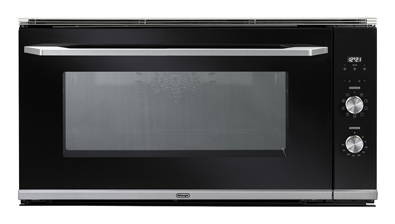 Forno elettrico multifunzione in vetro nero; cavità da 87 litri netti con telai laterali; speciali funzioni Termoventilata 3D e Girrarrosto.