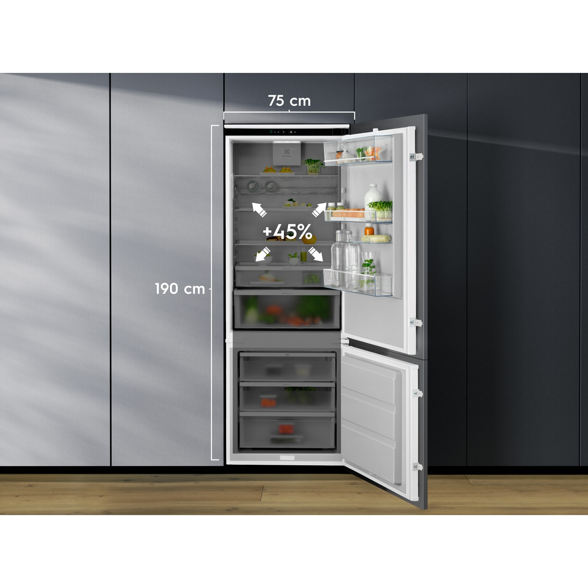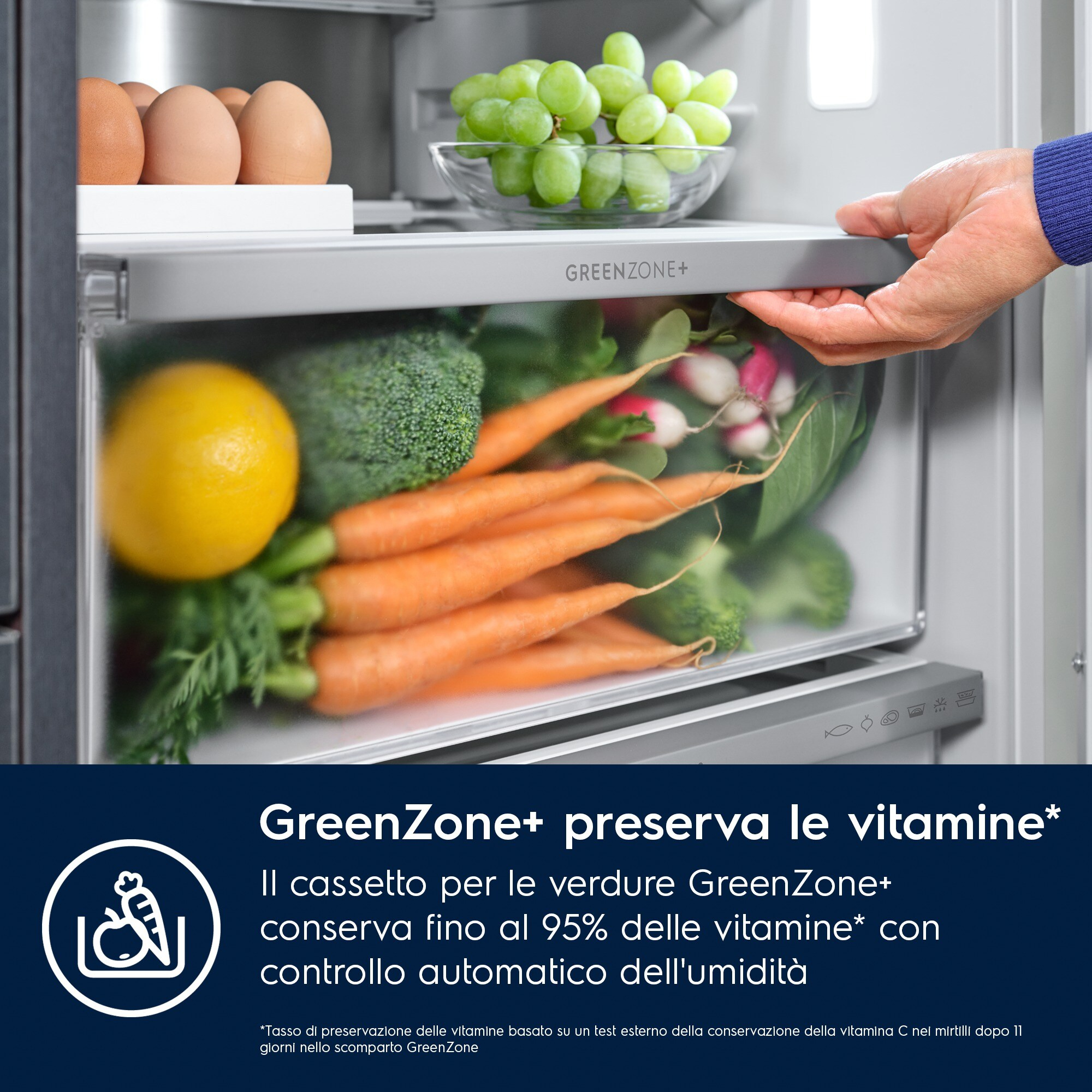 Il frigocongelatore GreenZone 700 ha un cassetto sigillato apposito con clima diverso in cui l’umidità viene gestita al livello ideale. Se conservi le verdure al livello giusto di umidità, puoi preservare fino al 95% di vitamine dopo 11 giorni[1].