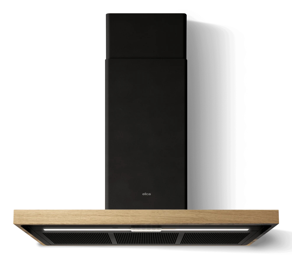 Una cappa a parete dal design originale contraddistinta dalle finiture bianco-matt o nero-matt, accostate al legno di rovere.