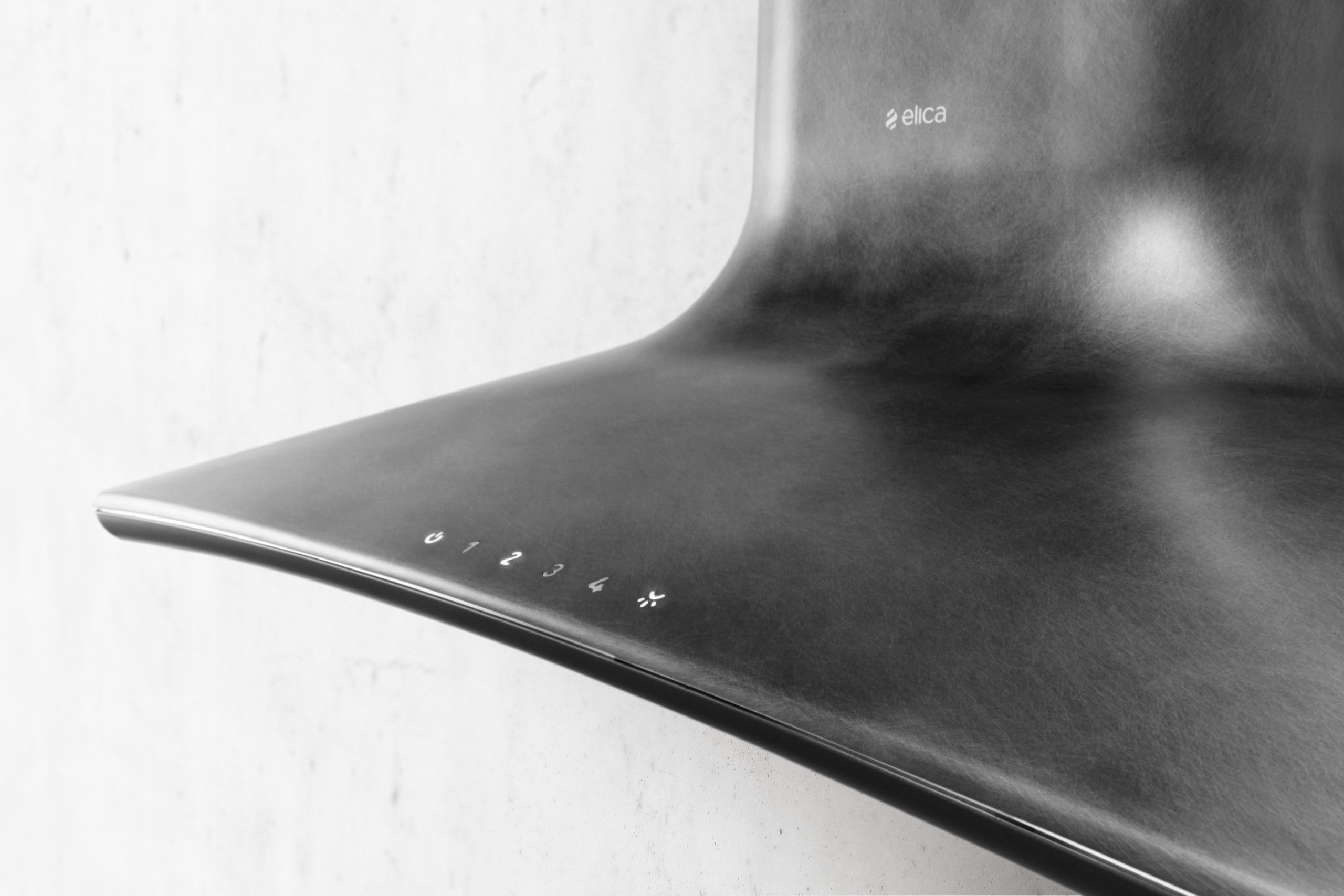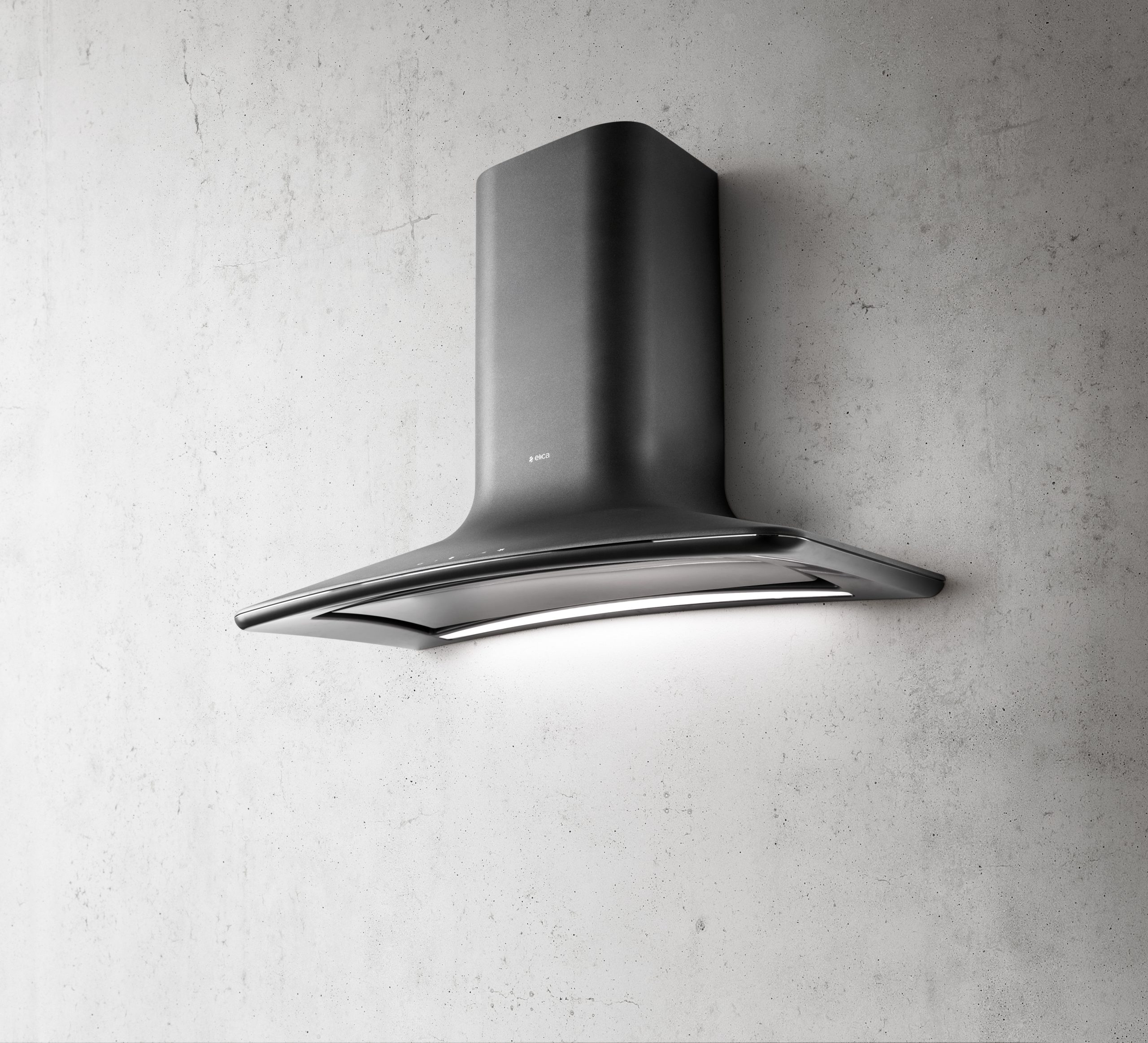 La cappa scende, si allarga, si curva e definisce una parete come fosse una scultura. Non è un oggetto d’arte post moderno mauna cappa. Il design la rende vissuta e ci suggestiona con il suo aspetto da industria di altri tempi. La realizzazione in tecnopolimero permette diottenere linee morbide che addolciscono le forme. Una sottile linea in acciaio lucido caratterizza l’elegante sistema di aspirazione perimetrale che permette di aumentare la velocità di captazione dei fumi di cottura.