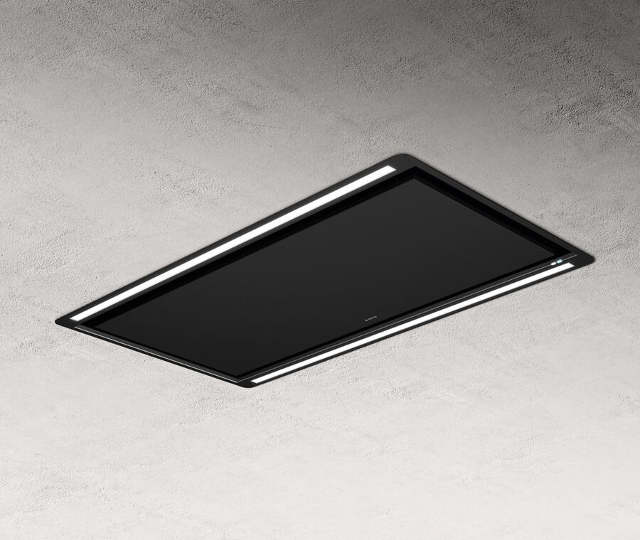 A filo con il soffitto, l’elegante pannello in acciaio inossidabile, con due raffinate strisce LED, nasconde con intelligenza il sistema estrattivo potente e silenzioso, progettato per garantire le massime prestazioni, anche a una distanza significativa dal piano cottura.