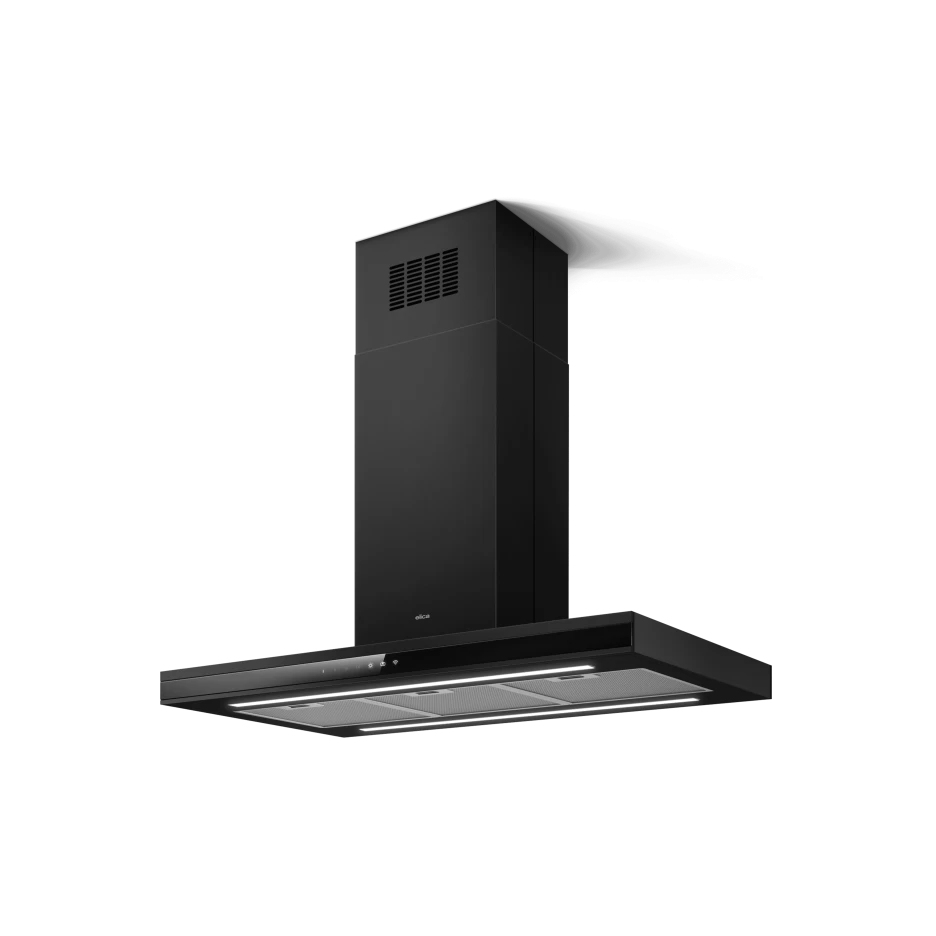 Un pannello frontale in vetro nero è inserito in un telaio di alluminio, esaltando le linee di questo elettrodomestico. La cappa è gestibile a distanza, tramite app o assistente vocale, e può essere connessa via bluetooth al piano a induzione Elica, regolando la potenza di aspirazione in base alle zone di cottura attive. Con una capacità di 770 m³/h alla massima velocità, offre un sistema di aspirazione con prestazioni eccellenti. Il comando a sfioro è nascosto dal vetro, i led illuminano il piano cottura con un basso consumo energetico.