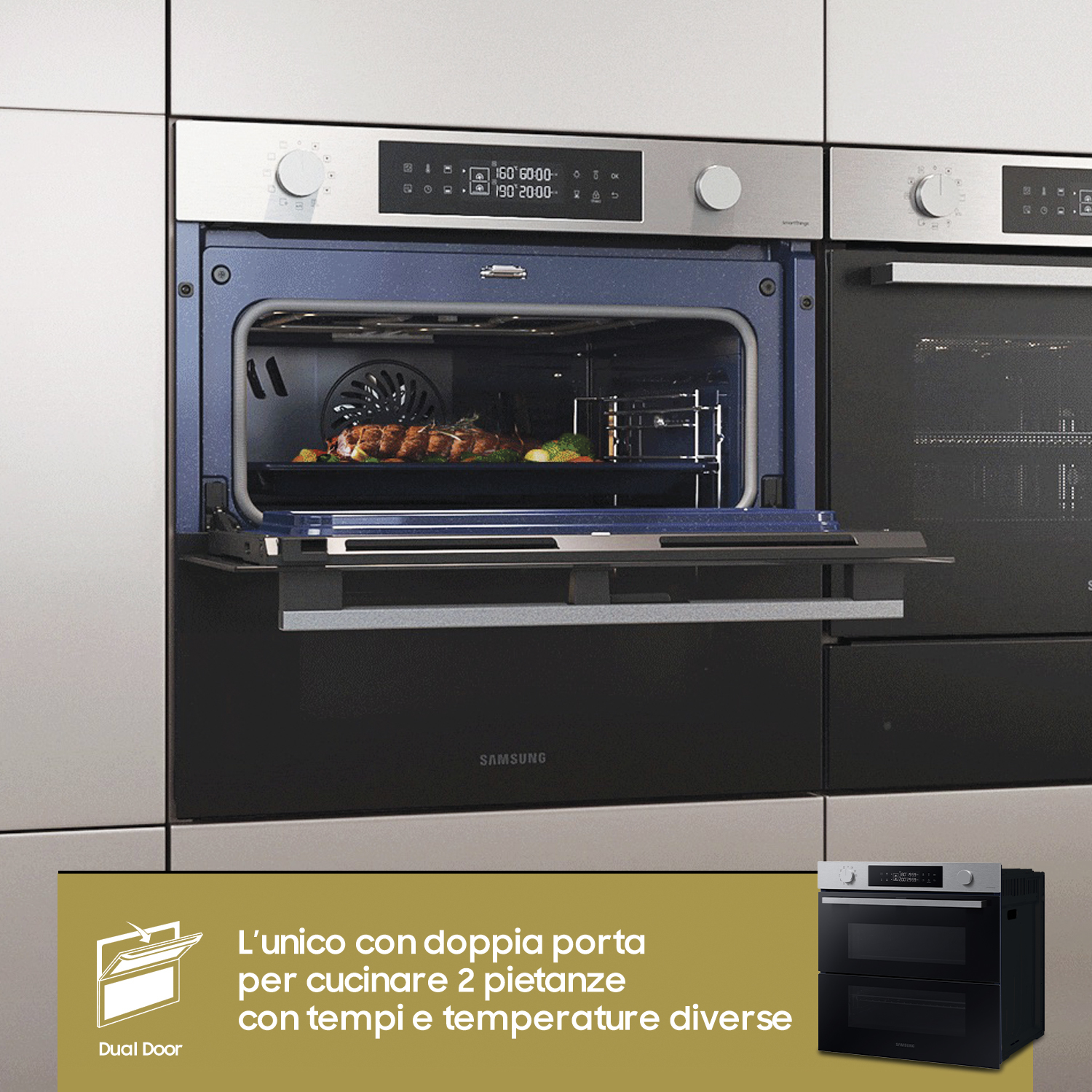 Prepara piatti diversi in modo più versatile ed efficiente. Le zone di cottura superiore e inferiore di Dual Cook Flex™ funzionano in modo indipendente. Utilizza la zona superiore per le pietanze più piccole, entrambe le zone con impostazioni diverse per temperatura e tempi di cottura, oppure lintero forno per cibi voluminosi. Grazie alla doppia porta puoi accedere facilmente alla parte superiore.