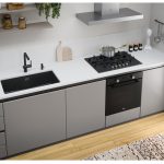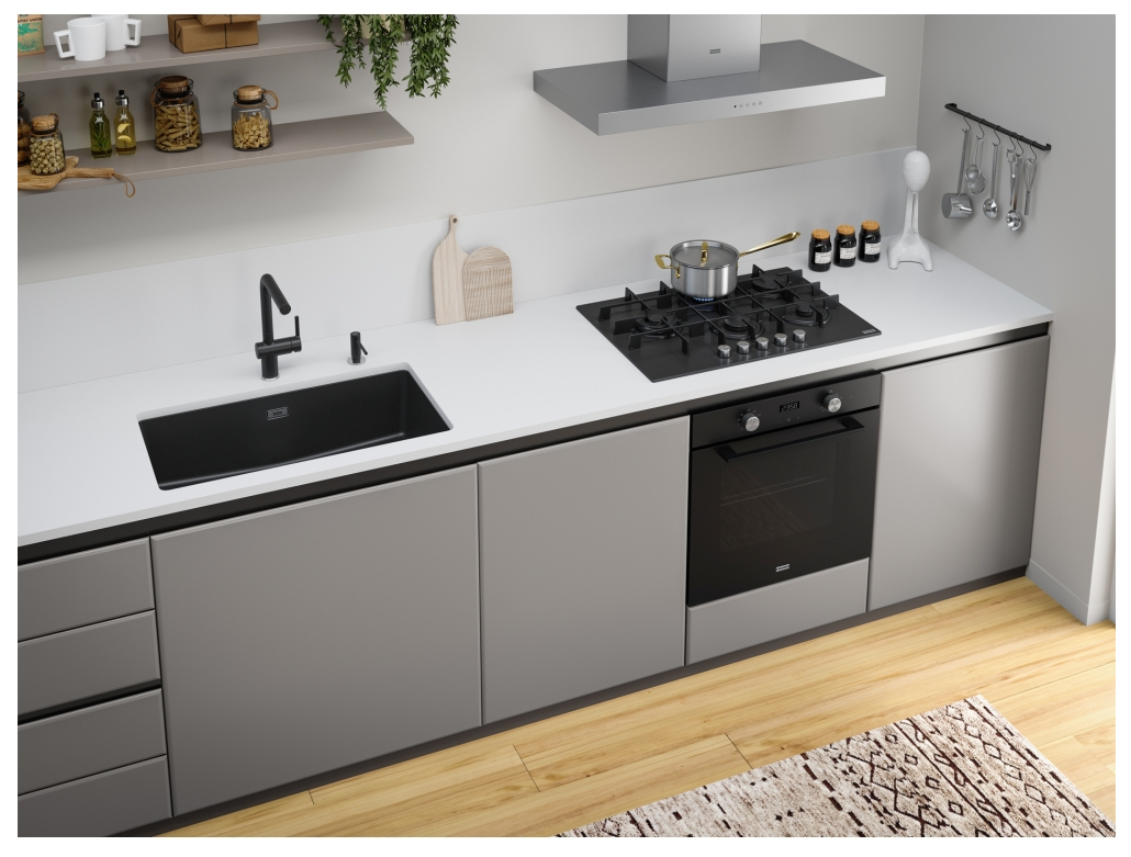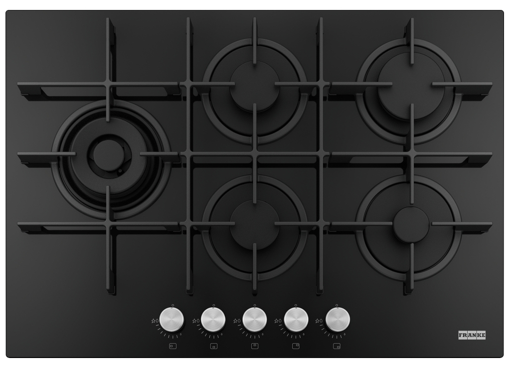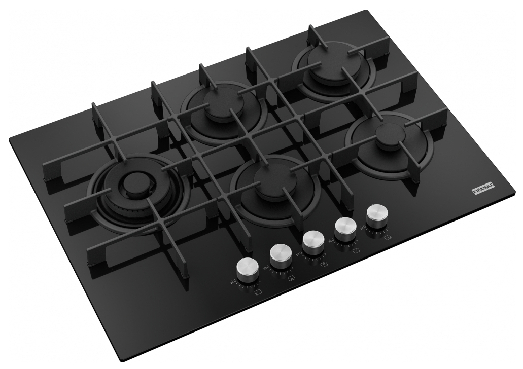 Il piano cottura a gas MARIS FHMA 755 4G DCL NERO in vetro temprato, dotato di 5 fuochi, di cui la doppia corona in posizione laterale sinistra per una migliore ergonomia e gestione degli spazi in cottura, si coordina perfettamente con le linee di lavelli in fragranite, i miscelatori, le cappe e i forni in finitura NERO e BLACK MATT