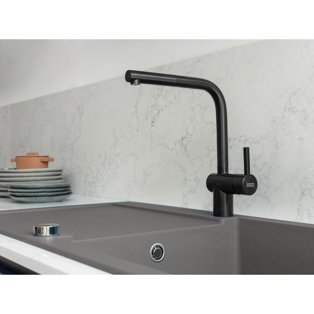 Il miscelatore Atlas Neo Doccia in finitura PVD Industrial Black si abbina armoniosamente alle vasche di tutte le collezioni in Fragranite Nero o Black Matt e alla vostra vasca integrata nel piano di lavoro, per creare un’area di lavoro elegante e funzionale allo stesso tempo