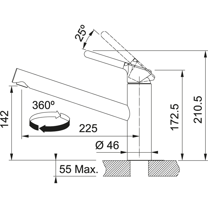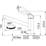 Franke 876476. Tipo di beccuccio: Standard, Colore del prodotto: Cromo, Materiale del rubinetto: Ottone. Altezza (max): 21 cm, Altezza sopra la superficie di fissaggio (max): 14,2 cm, Lunghezza del tubo di alimentazione: 45 cm