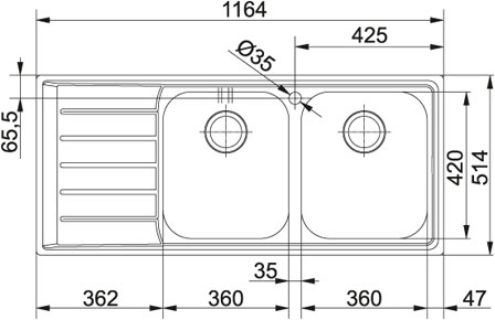 Franke NEX 221. Colore del prodotto: Acciaio inox, Numero di vasche per lavello: 2 ciotole, Dimensioni prima vasca (LxL): 360 x 420 mm. Larghezza: 1164 mm, Profondità: 514 mm, Larghezza del compartimento: 98,8 cm