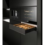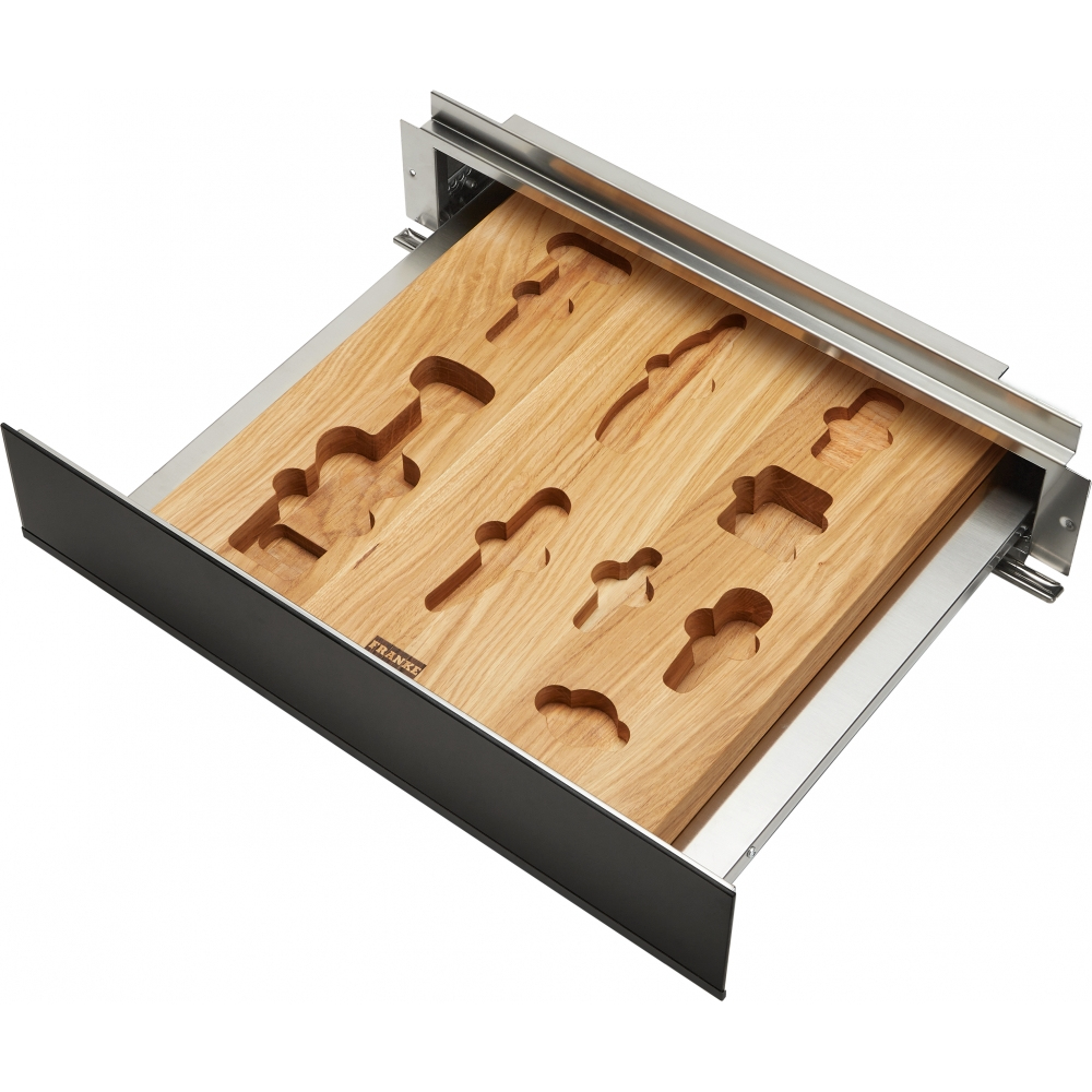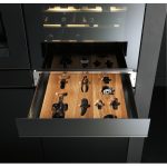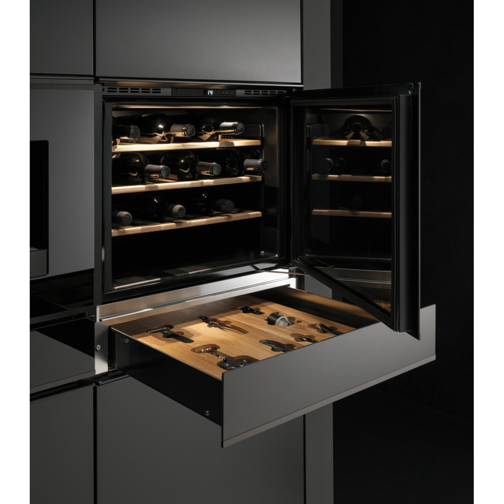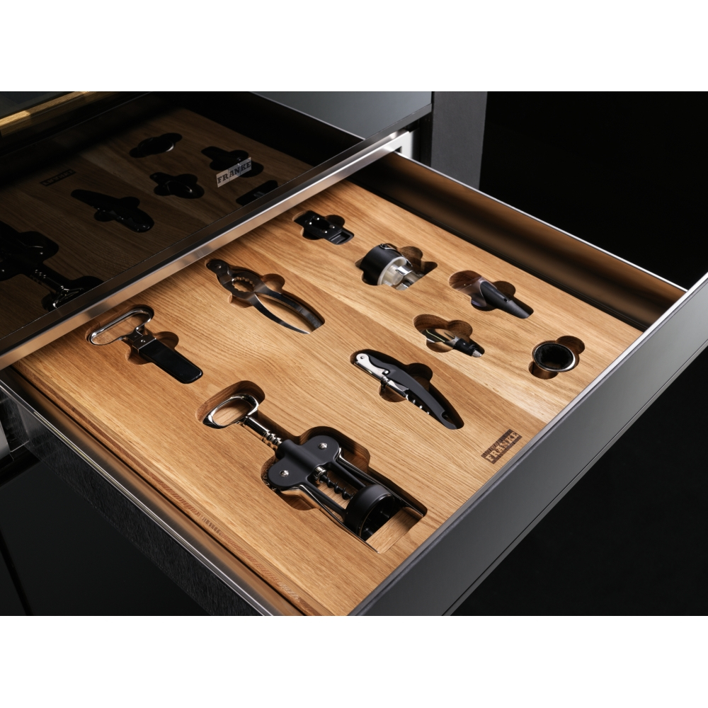 Il cassetto accessori per cantinetta da vino FMY 14 WCRD BK è completo di cavatappi ad ala, cavatappi sommelier, cavatappi a lama, apribottiglie per champagne, anello salvagoccia, versatore per vino, versatore per champagne, tappo per champagne, taglierino apri- collarino