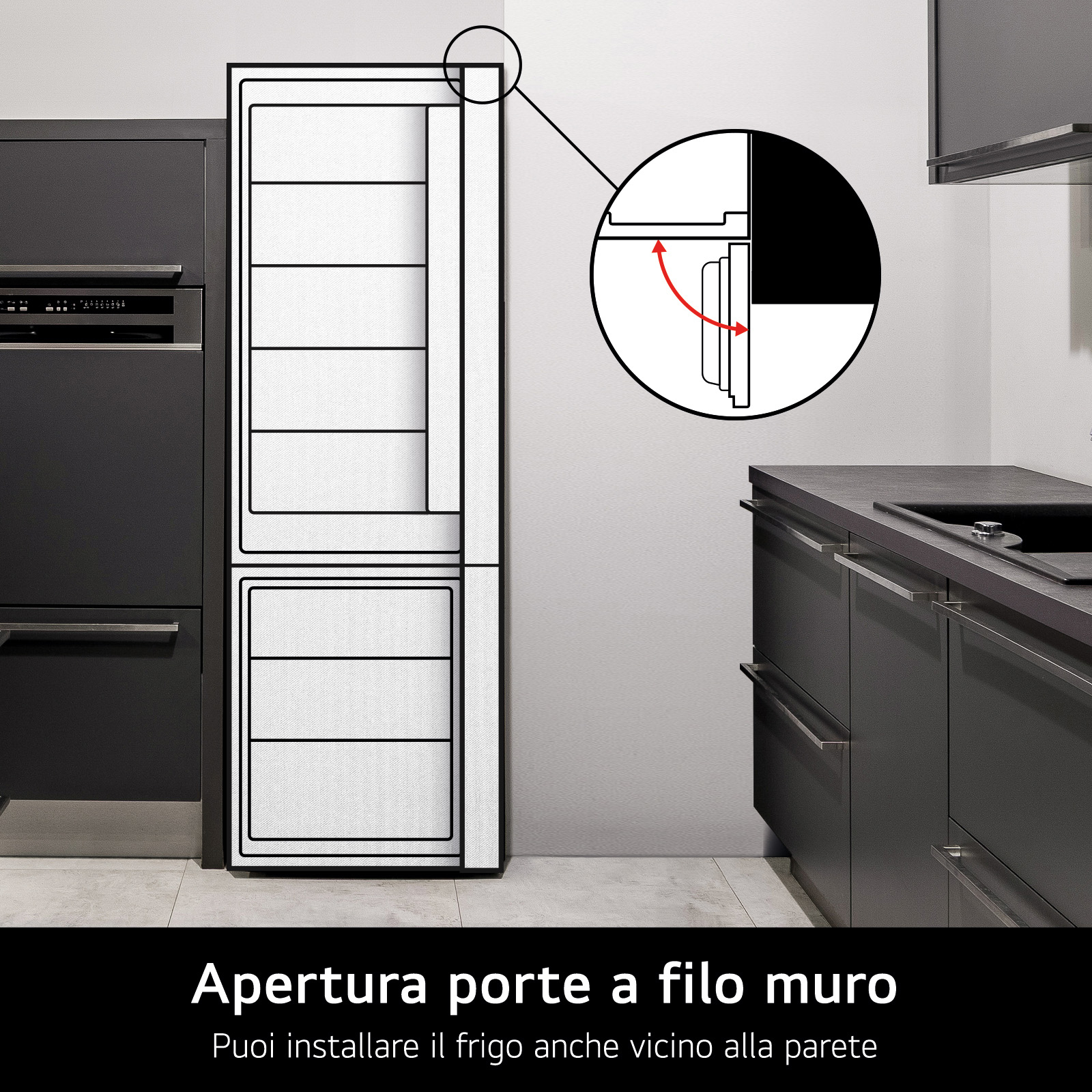 La porta del frigorifero è predisposta per aprirsi da sinistra verso destra, ma puoi invertire il verso di apertura in modo da adattarlo all’arredamento della tua cucina. L’intervento di inversione della porta deve essere effettuato da personale specializzato. Verifica il servizio con il tuo punto vendita oppure contatta un centro assistenza LG per effettuarlo quando preferisci.