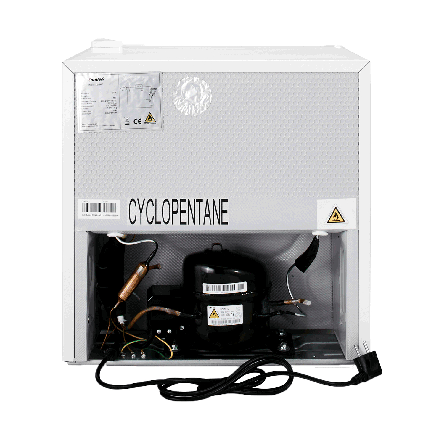 Comfeé RCD76WH2. Capacità netta frigorifero: 43 L, Classe climatica: SN-T, Emissione acustica: 41 dB. Numero di ripiani frigorifero: 2, Cerniera porta: Destra. Consumo energetico annuo: 80 kWh, Classe efficienza energetica: E. Peso: 14,7 kg. Colore del prodotto: Bianco