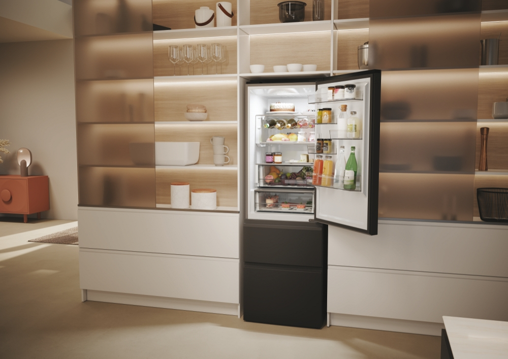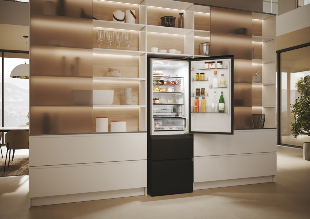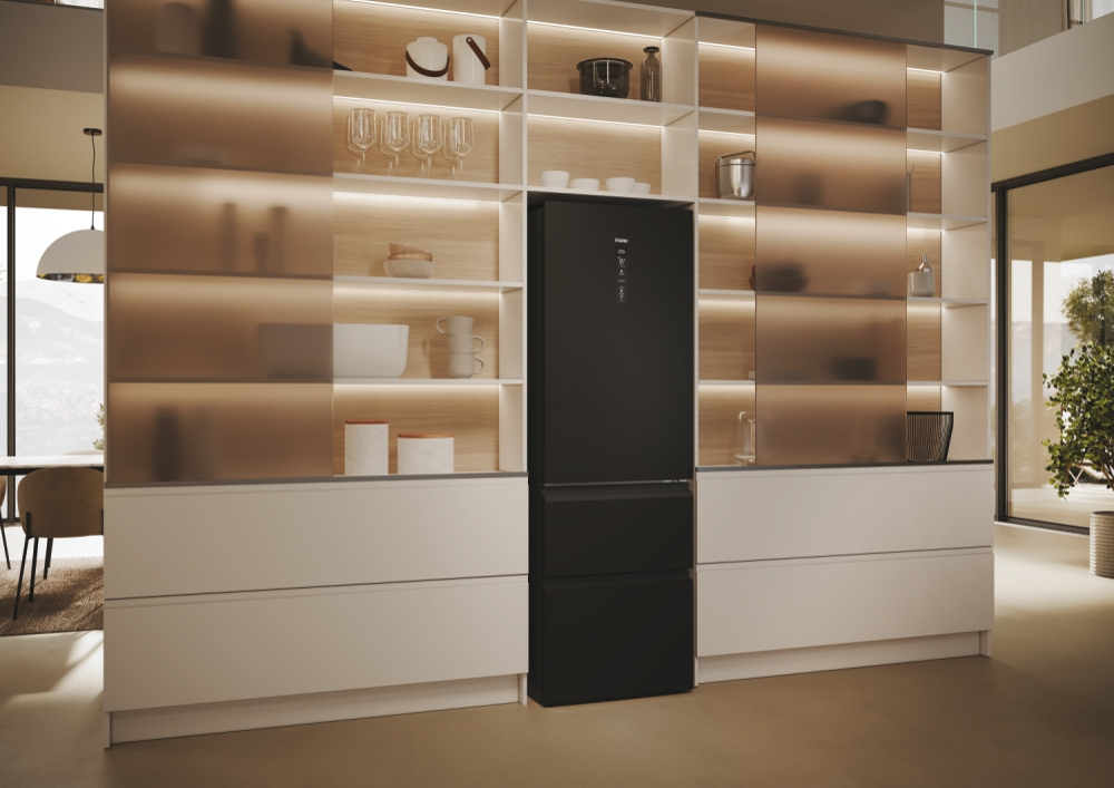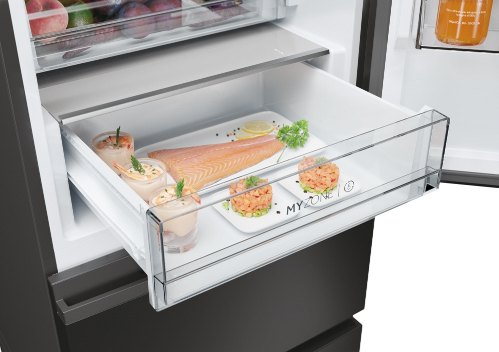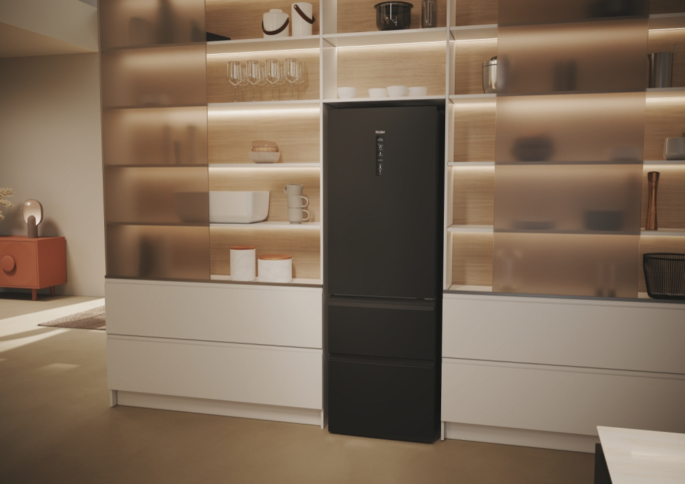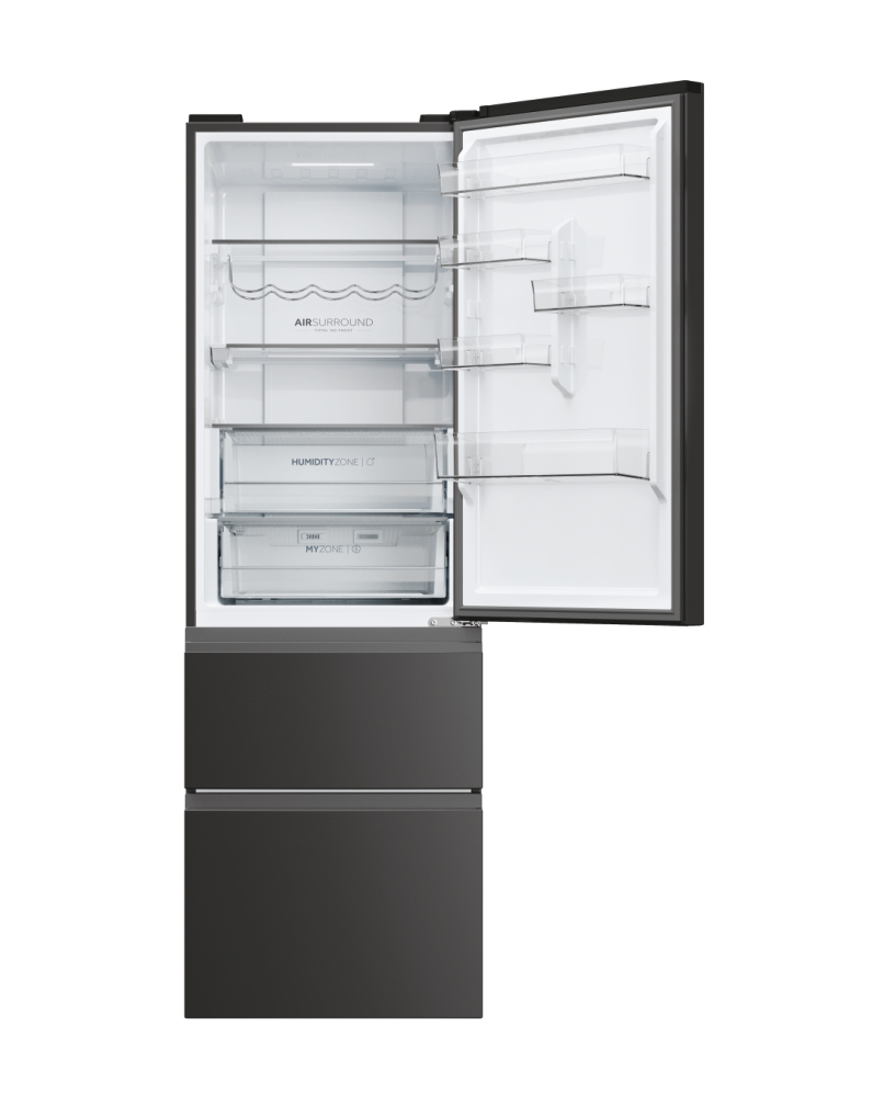Haier 3D 60 Serie 5 HTW5618DNPT. Capacità netta totale: 360 L. Cerniera porta: Destra. Classe climatica: T, Emissione acustica: 35 dB. Capacità netta frigorifero: 235 L, No Frost (frigorifero), Sistema Multi-Airflow (frigorifero), Luce interna, Numero di ripiani frigorifero: 3. Capacità netta congelatore: 125 L, Capacità di congelamento: 10 kg/24h, No Frost (congelatore). Classe efficienza energetica: D, Consumo energetico annuo: 217 kWh. Colore del prodotto: Nero