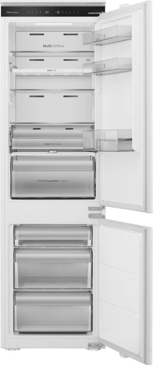 Hisense RB3B250SEWE1. Capacità netta totale: 252 L. Cerniera porta: Destra, Tipo di display: LED. Classe climatica: SN-N, Emissione acustica: 35 dB. Capacità netta frigorifero: 176 L, No Frost (frigorifero), Sistema Multi-Airflow (frigorifero), Luce interna. Capacità netta congelatore: 76 L, Capacità di congelamento: 6 kg/24h, No Frost (congelatore). Compartimento zona fresca. Classe efficienza energetica: E, Consumo energetico annuo: 235 kWh