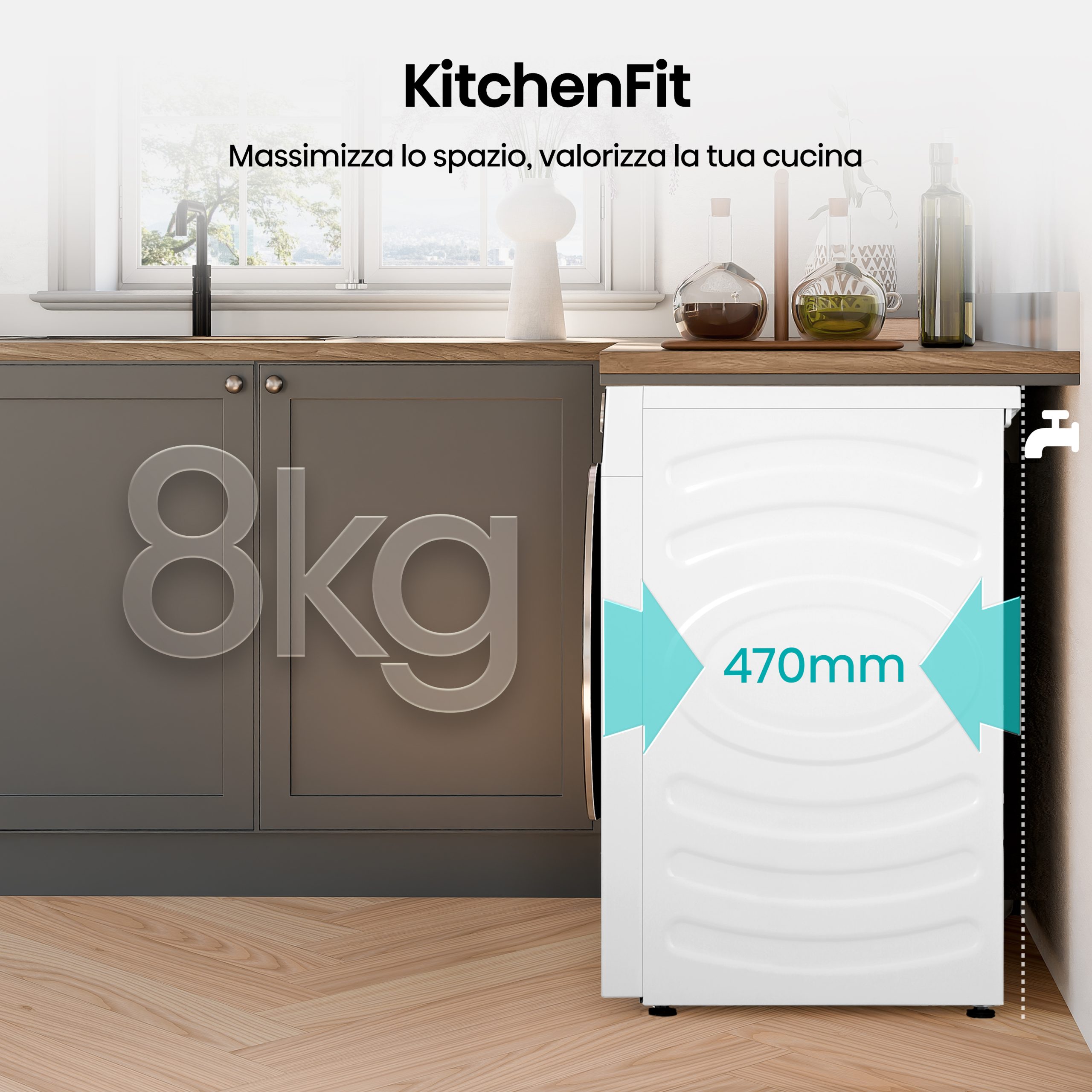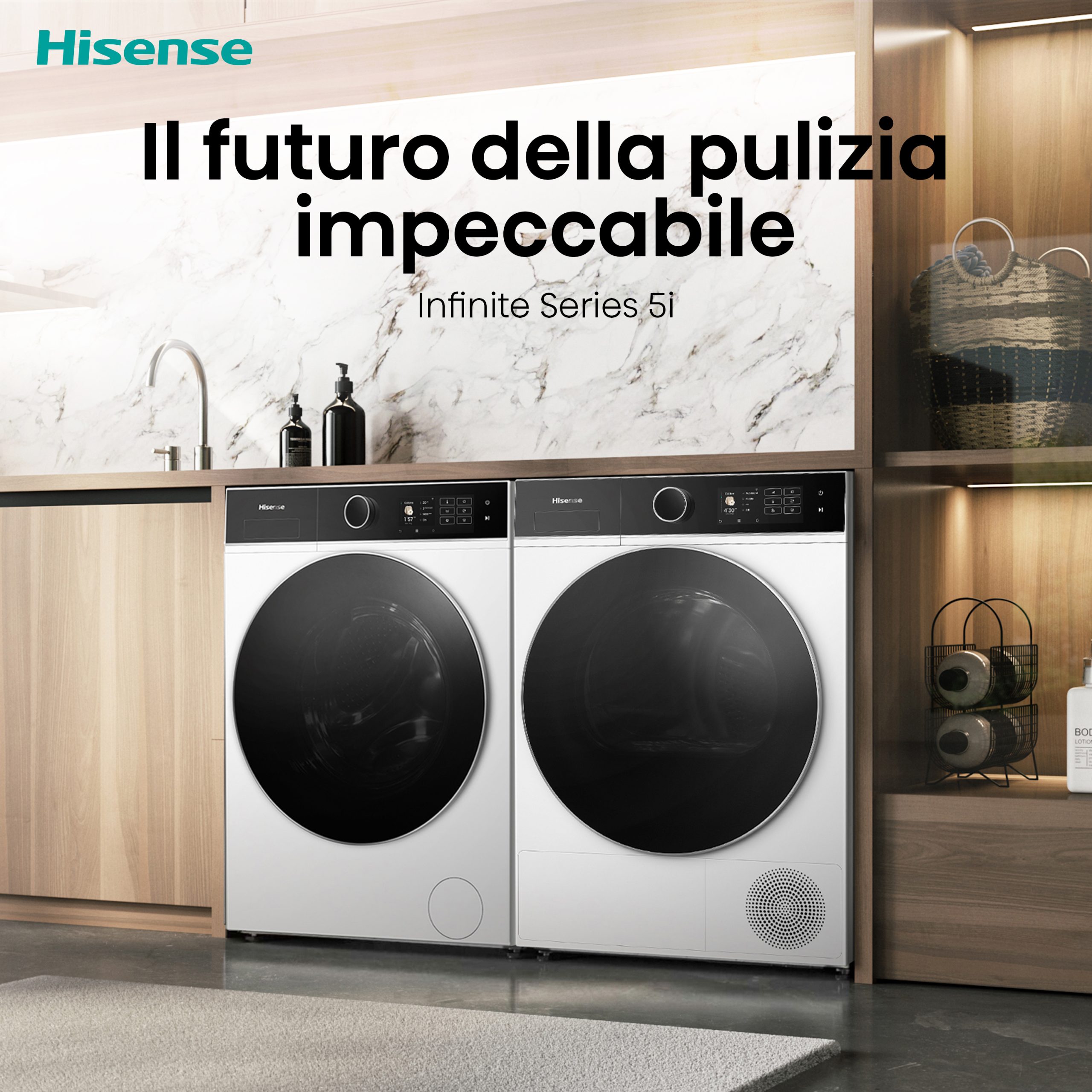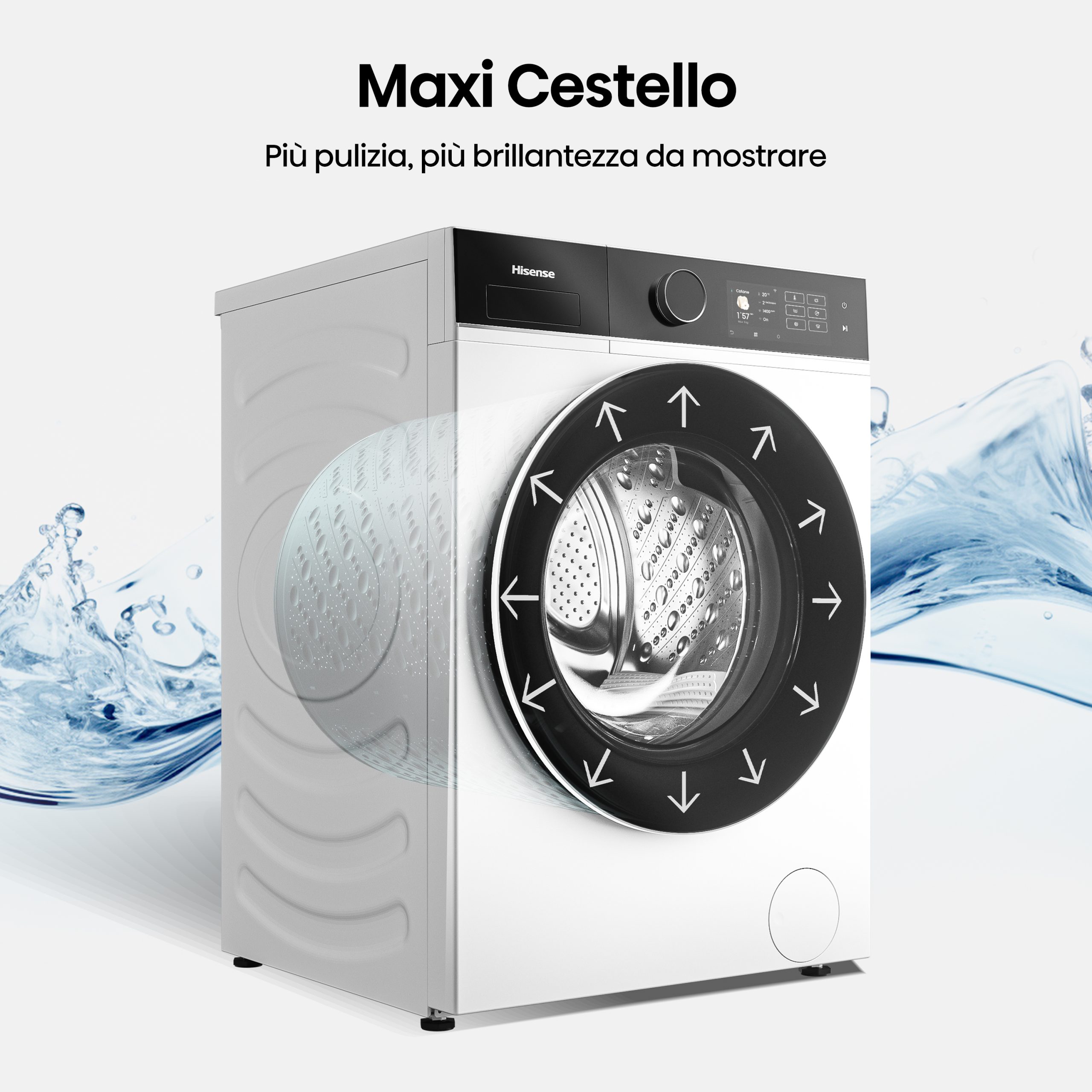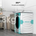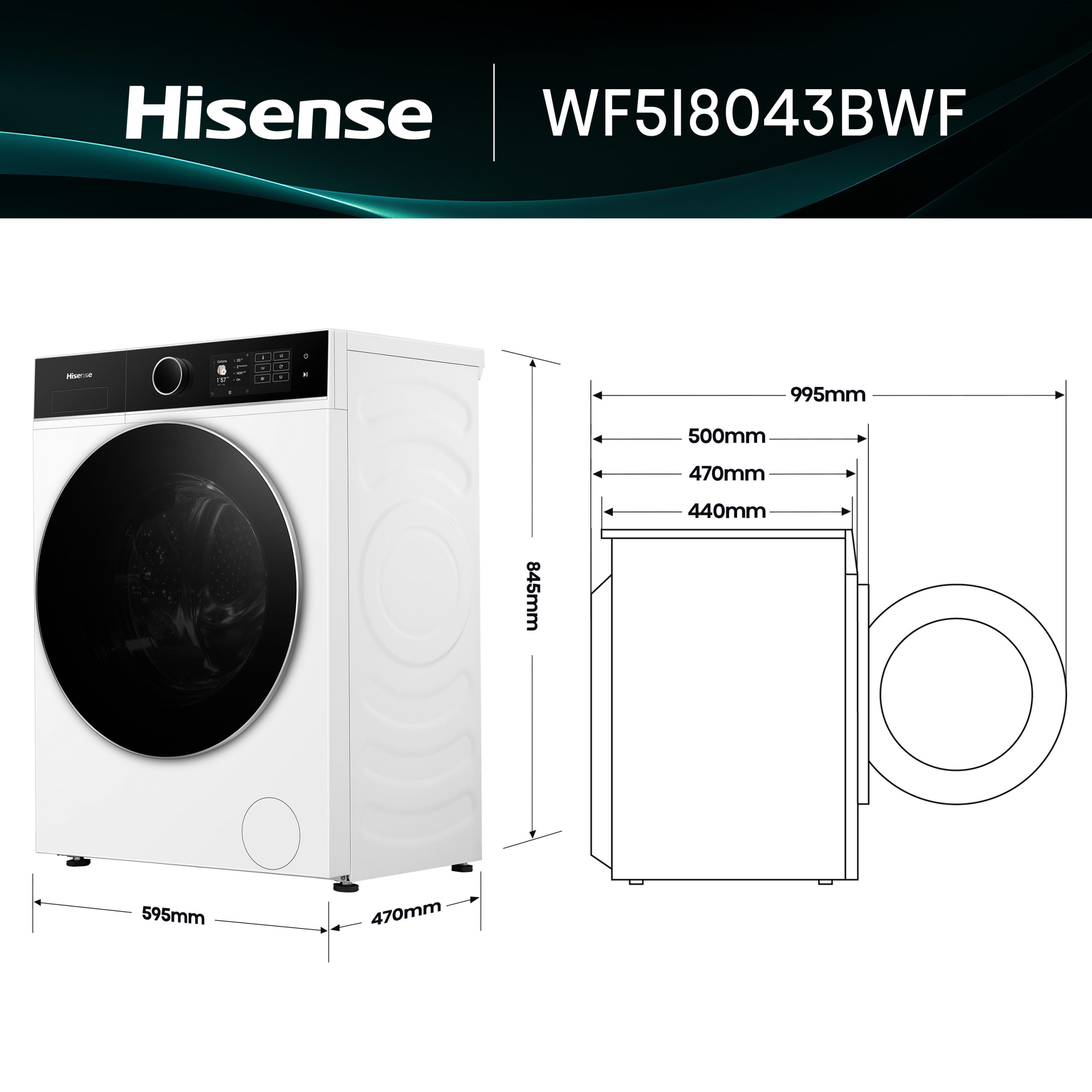 Hisense WF5I8043BWF. Tipo di carica: Caricamento frontale. Capacità cestello: 8 kg, Classe di efficienza della centrifuga: B, Silenziosità (centrifuga): 72 dB, Velocità di centrifuga massima: 1400 Giri/min. Colore del prodotto: Bianco. Larghezza: 595 mm, Profondità: 470 mm, Altezza: 845 mm. Classe efficienza energetica: A
