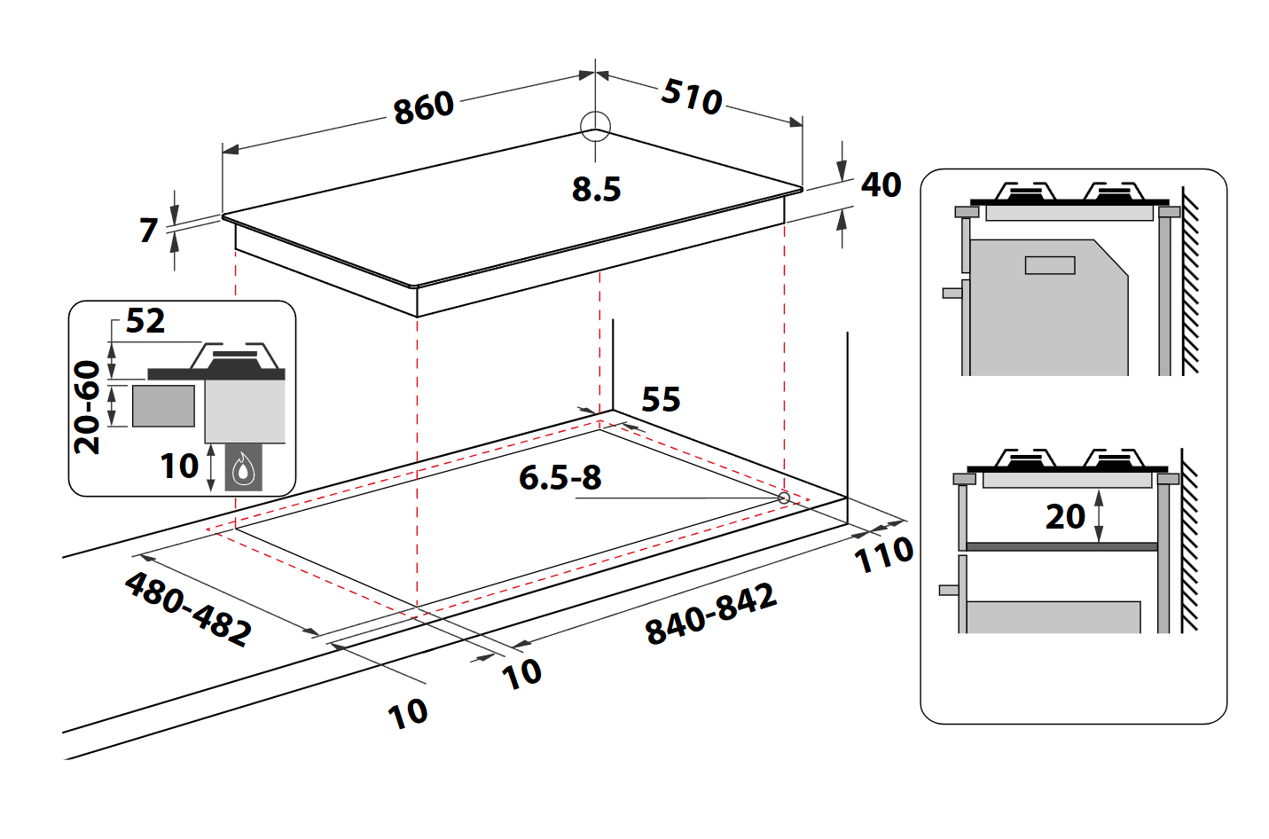 | Dimensione della larghezza del piano cottura (cm) | |