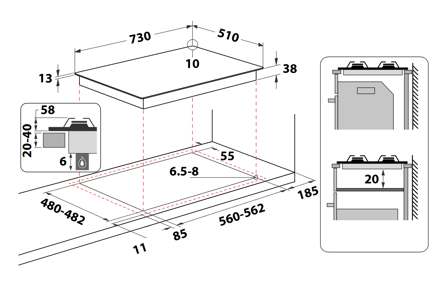 | Dimensione della larghezza del piano cottura (cm) | |