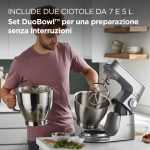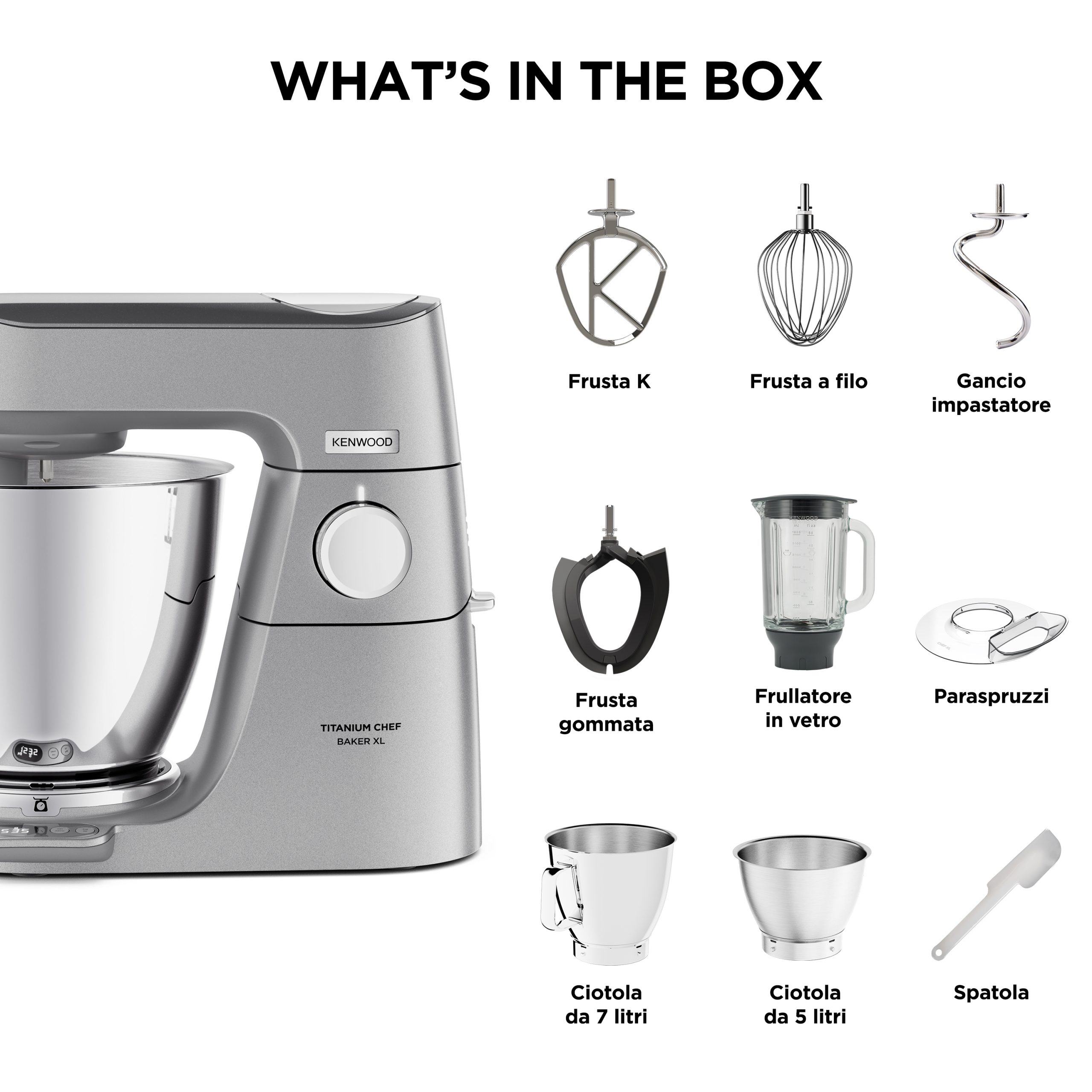 Titanium Chef Baker XL, la tua impastatrice che PESA. Motore 1200W, movimento planetario, ciotola capiente da 7l e ciotola aggiuntiva da 5l, entrambe in acciaio inox, bilancia integrata, schermo LCD con timer, utensili per la miscelazione in acciaio inox che includono: frusta K, frusta a filo, gancio impastatore, frusta gommata con 1 guaina. In dotazione: Frullatore in vetro termoresistente. Cover PopTop ™ intercambiabili.