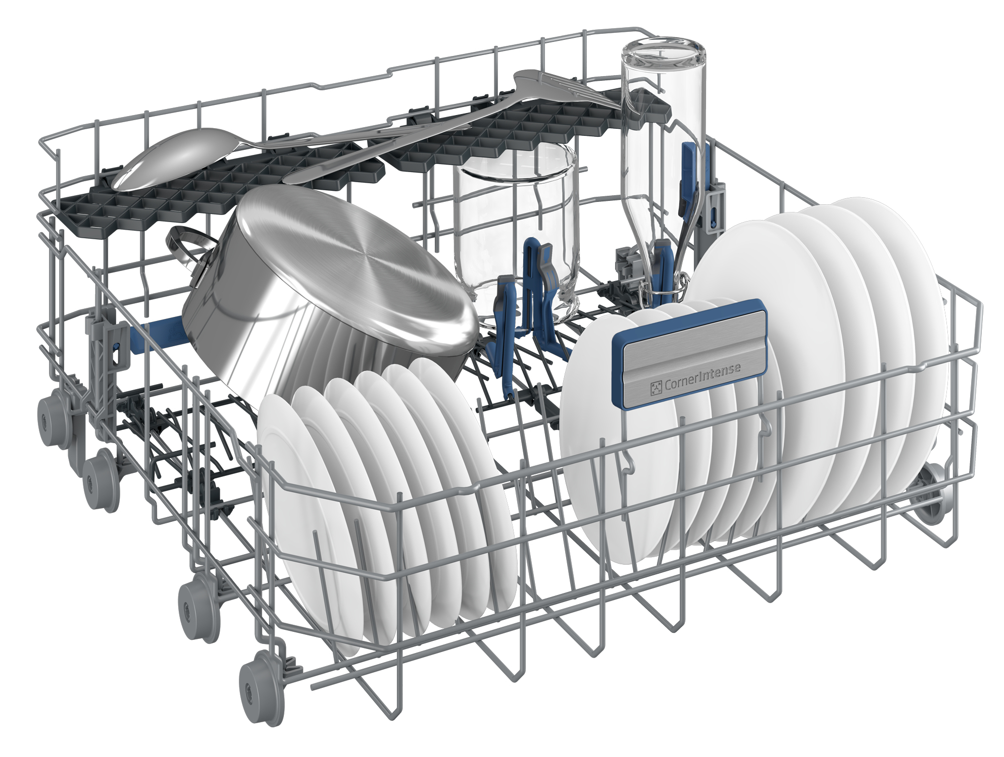 A differenza dei bracci irroratori classici che si muovono in senso circolare, CornerIntense™ è progettato per pulire un’area rettangolare. Acqua e detersivo raggiungono così ogni punto, angoli compresi