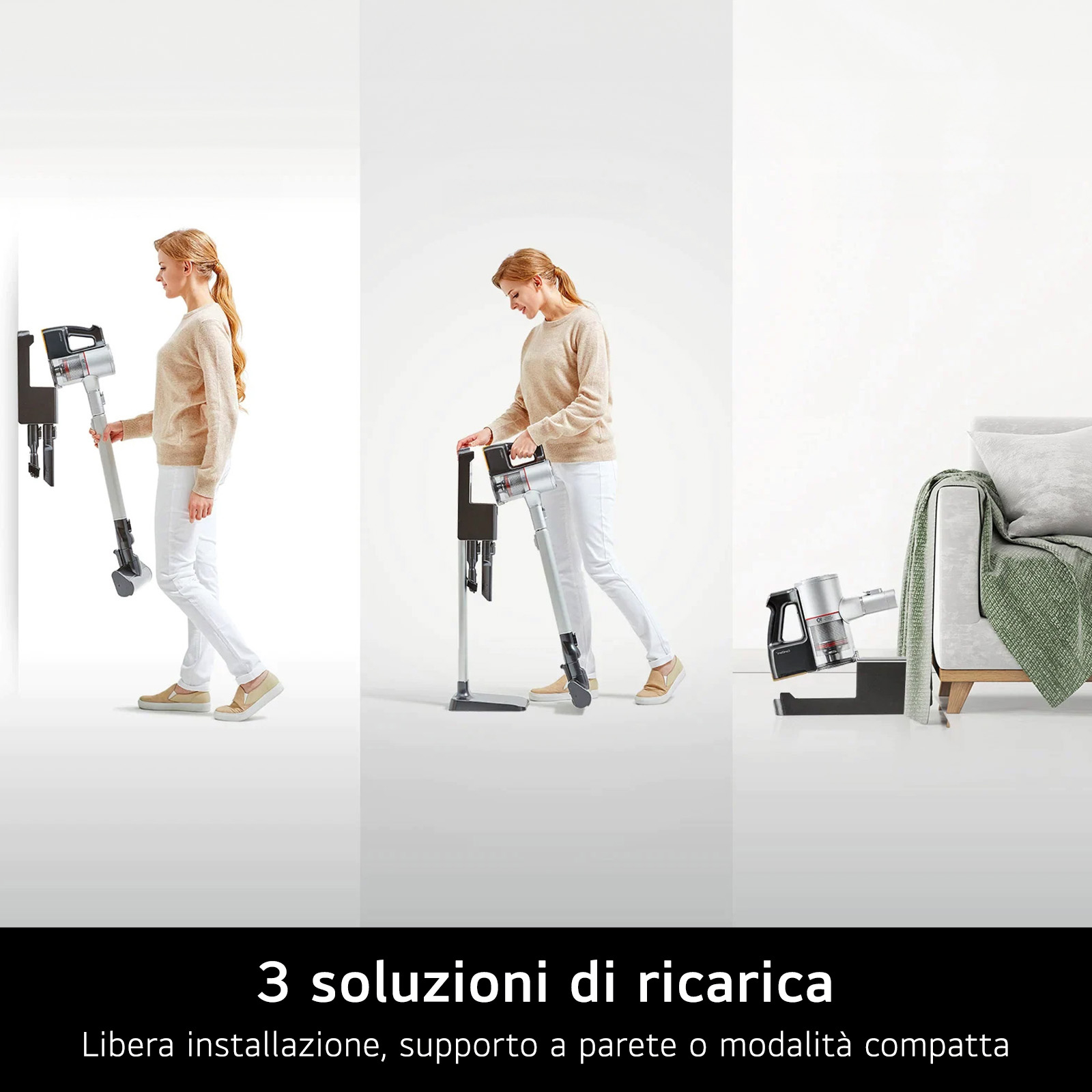 Puoi installare l’aspirapolvere CordZero nella modalità che preferisci. Il piedistallo autoportante ti permette di installarlo dove vuoi, senza forare il muro. Altrimenti puoi decidere la classima installazione fissa a parete o, se preferisci una soluzione più compatta, puoi usare la soluzione salva-spazio appoggiando in orizzontale la base di ricarica su un mobile.