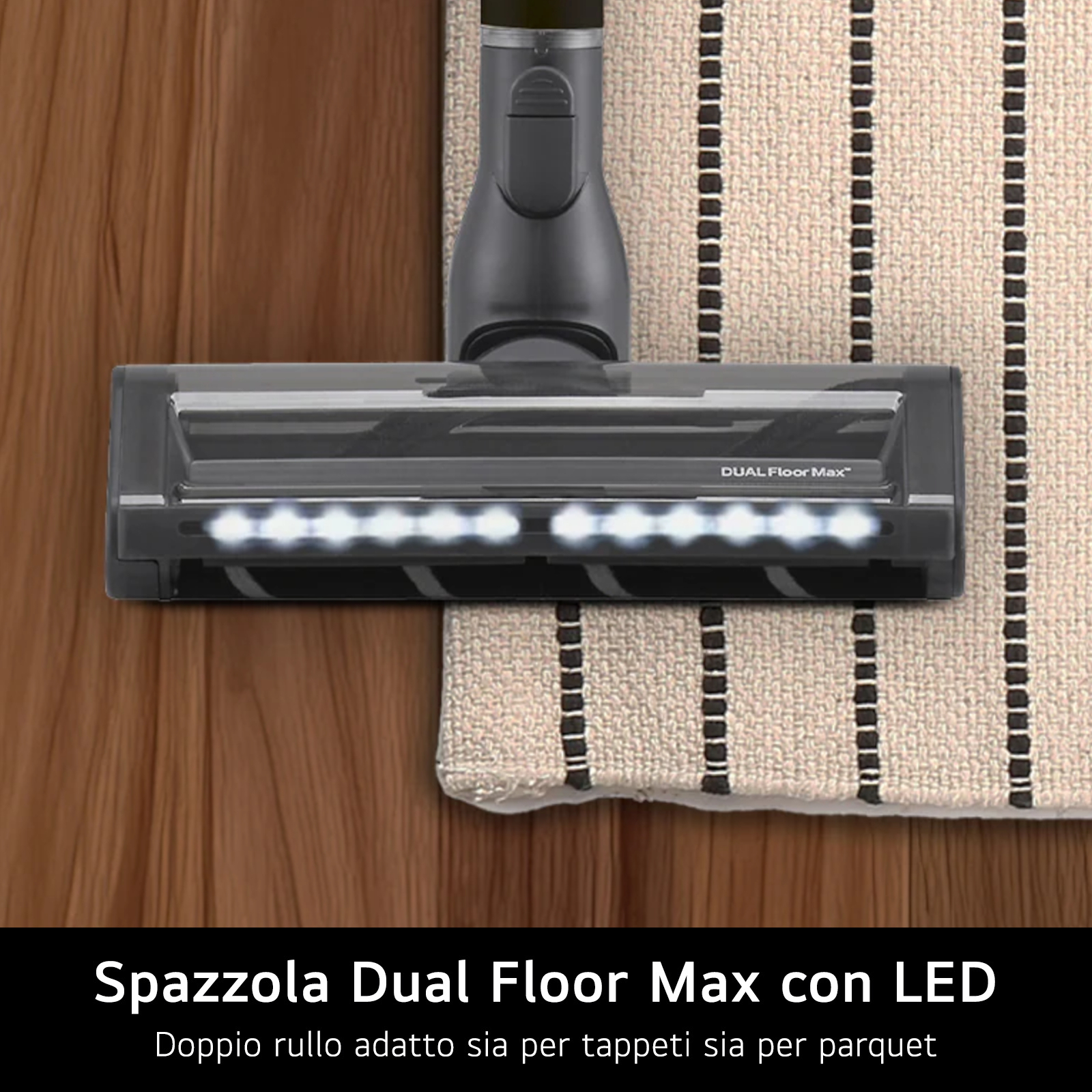 Grazie al suo doppio rullo motorizzato puoi aspirare parquet e tappeti senza cambiare spazzola. Inoltre, il LED rivela polvere integrato ti permette di individuare facilmente lo sporco per un pulito perfetto.