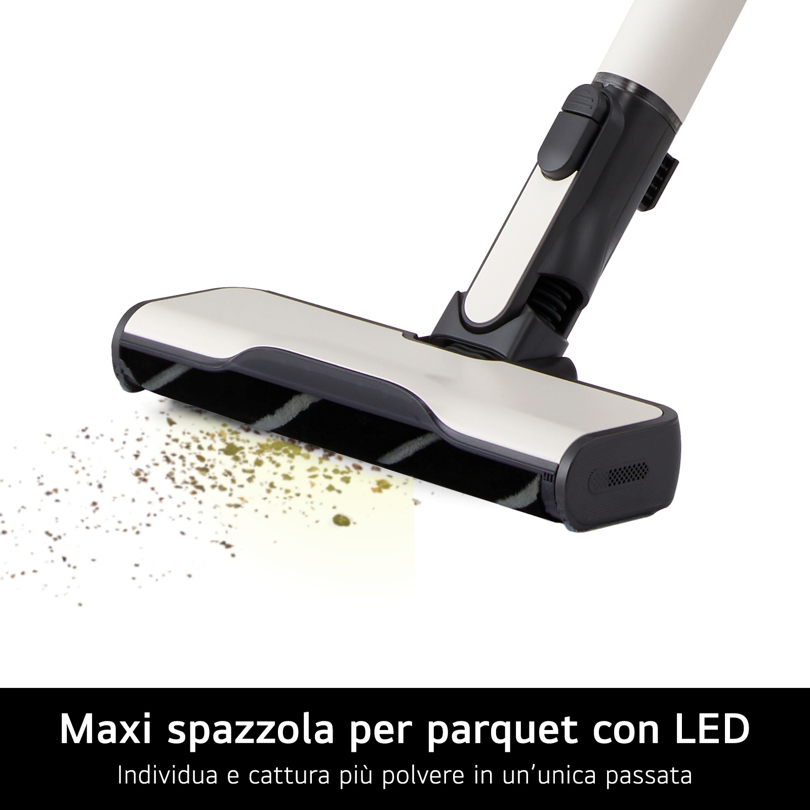 Con la maxi spazzola per parquet con illuminazione LED rivela polvere individui facilmente la polvere e, grazie alle dimensioni più grandi, riesci a catturarne di più in un’unica passata.