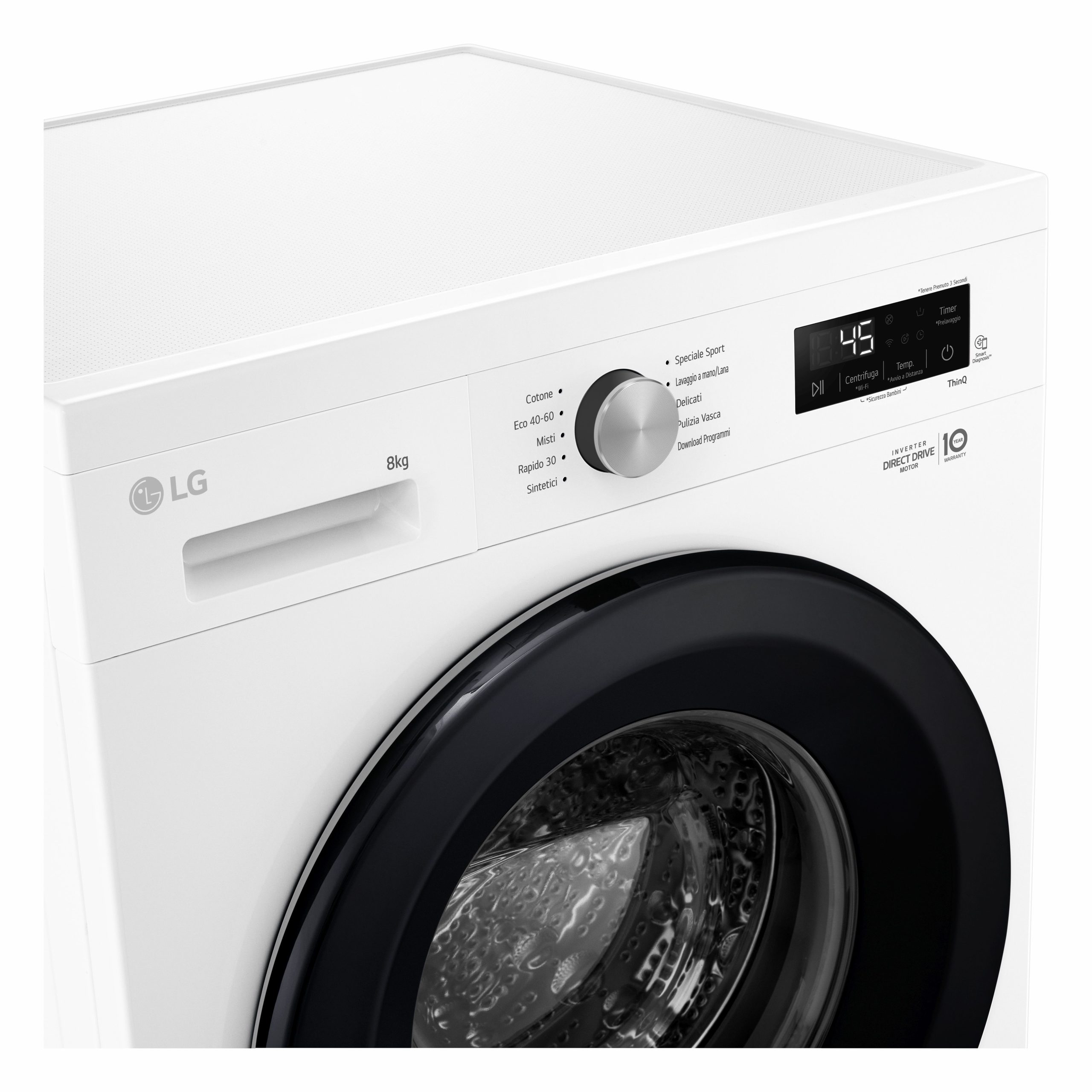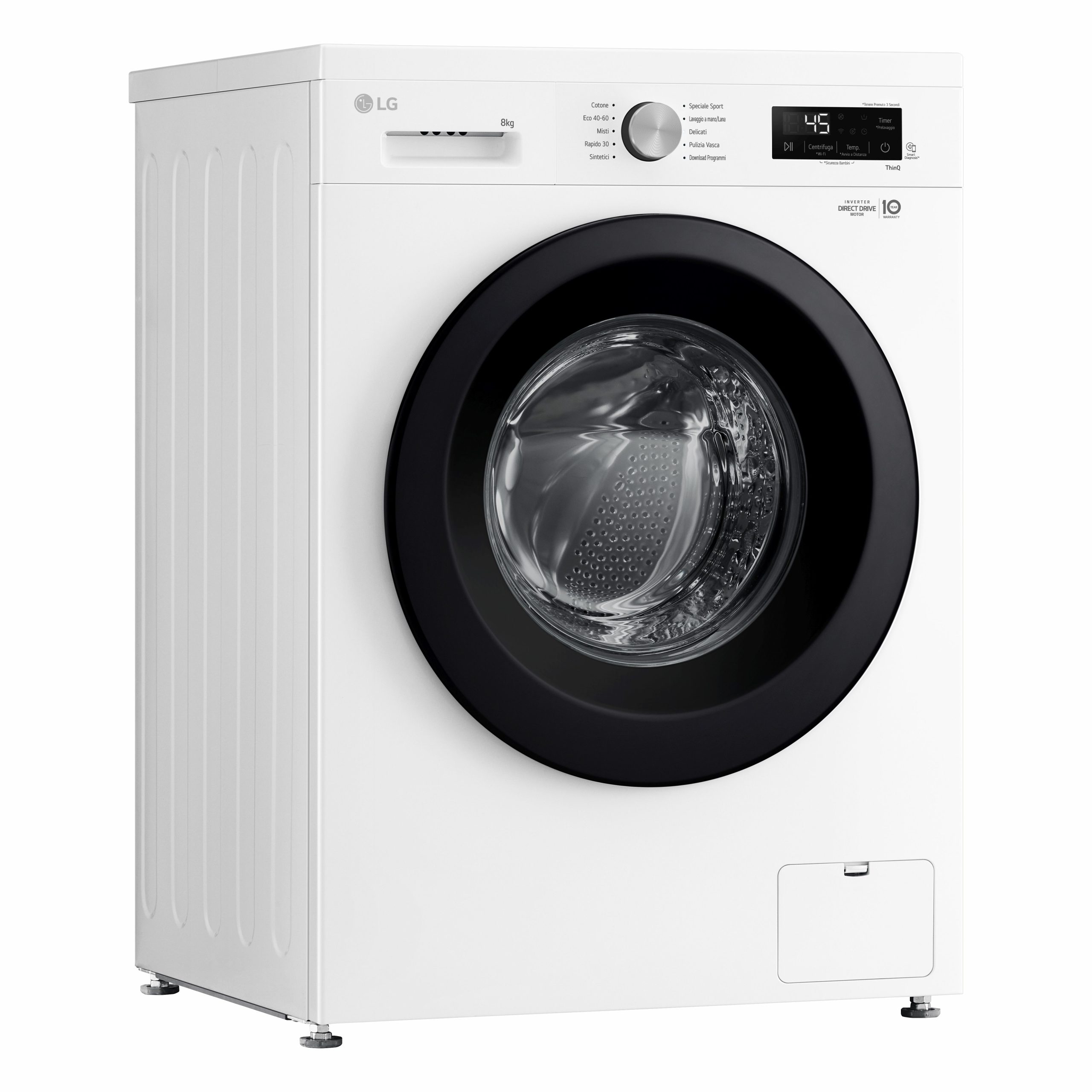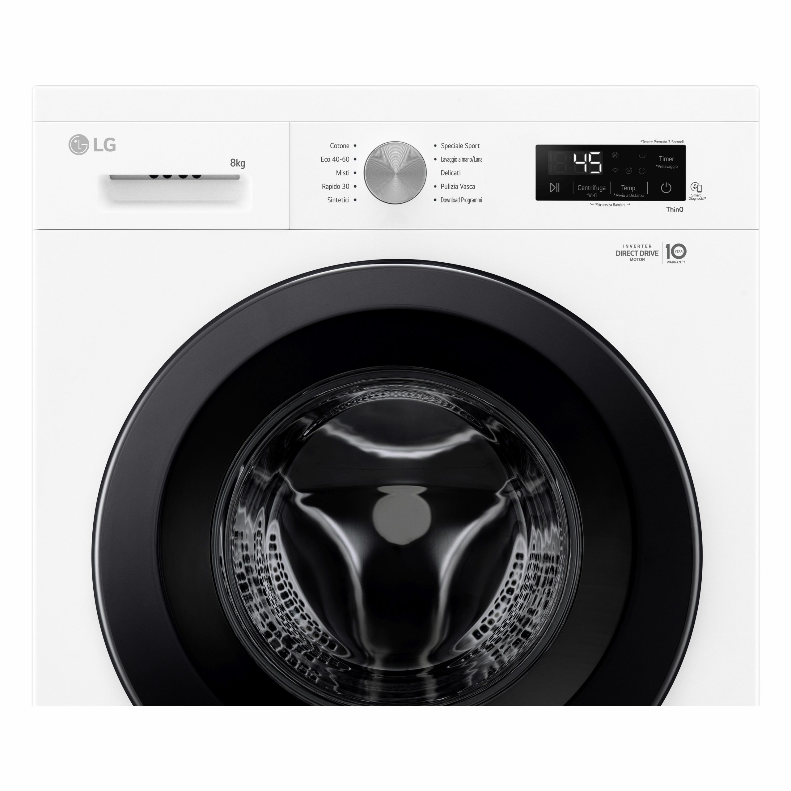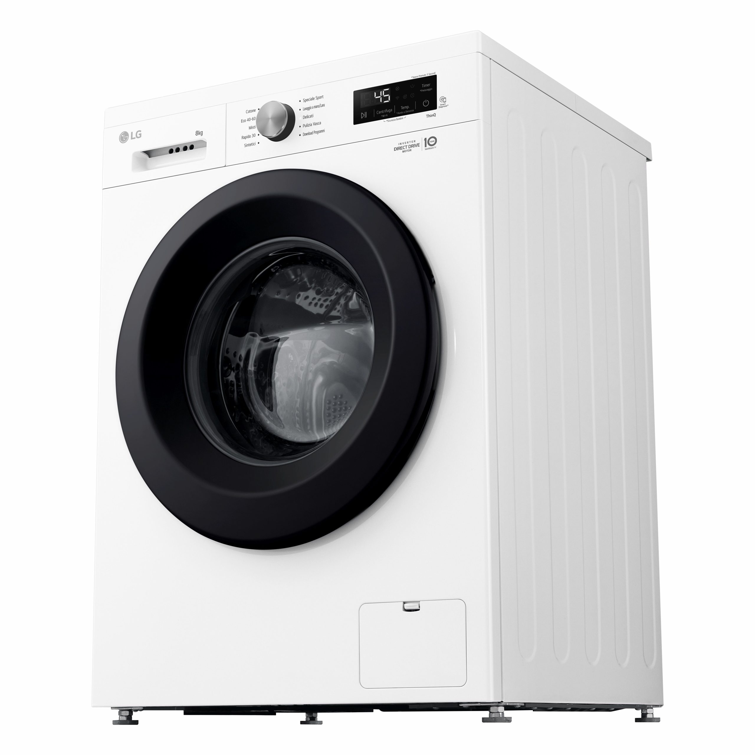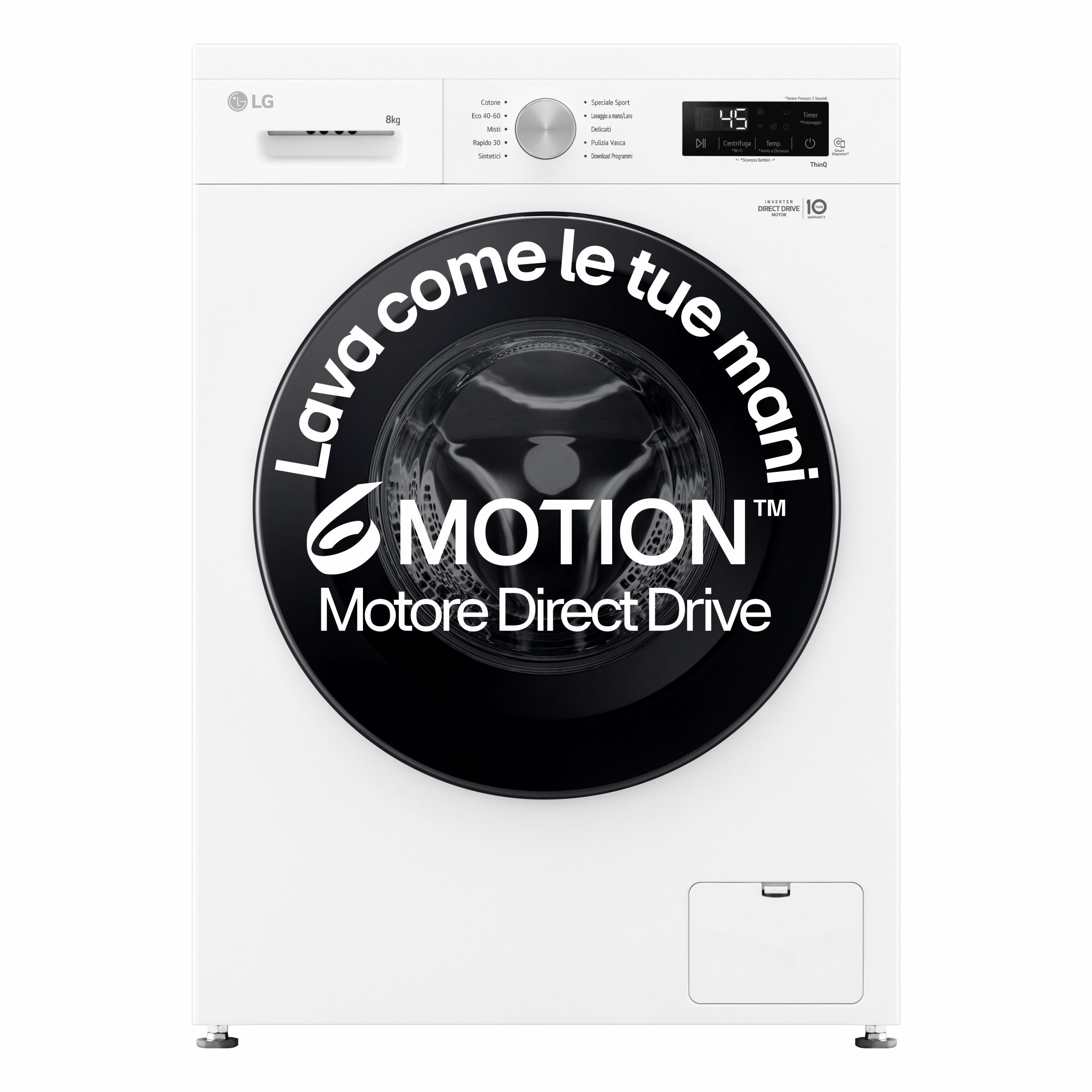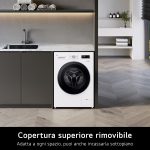 Collega la lavatrice al Wi-Fi di casa e scarica l’app LG ThinQ sul tuo smartphone per controllarla da remoto e monitorarne i consumi. Quando il ciclo di lavaggio è terminato, l’app ThinQ ti avviserà con una comoda notifica. Puoi scaricare anche nuovi programmi di lavaggio specifici in base al bucato che devi fare.”