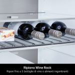 L’interno del frigo è progettato per adattarsi a ogni esigenza: i ripiani regolabili ti permettono di creare lo spazio che serve, il wine rack contiene fino a cinque bottiglie o alimenti ingombranti.