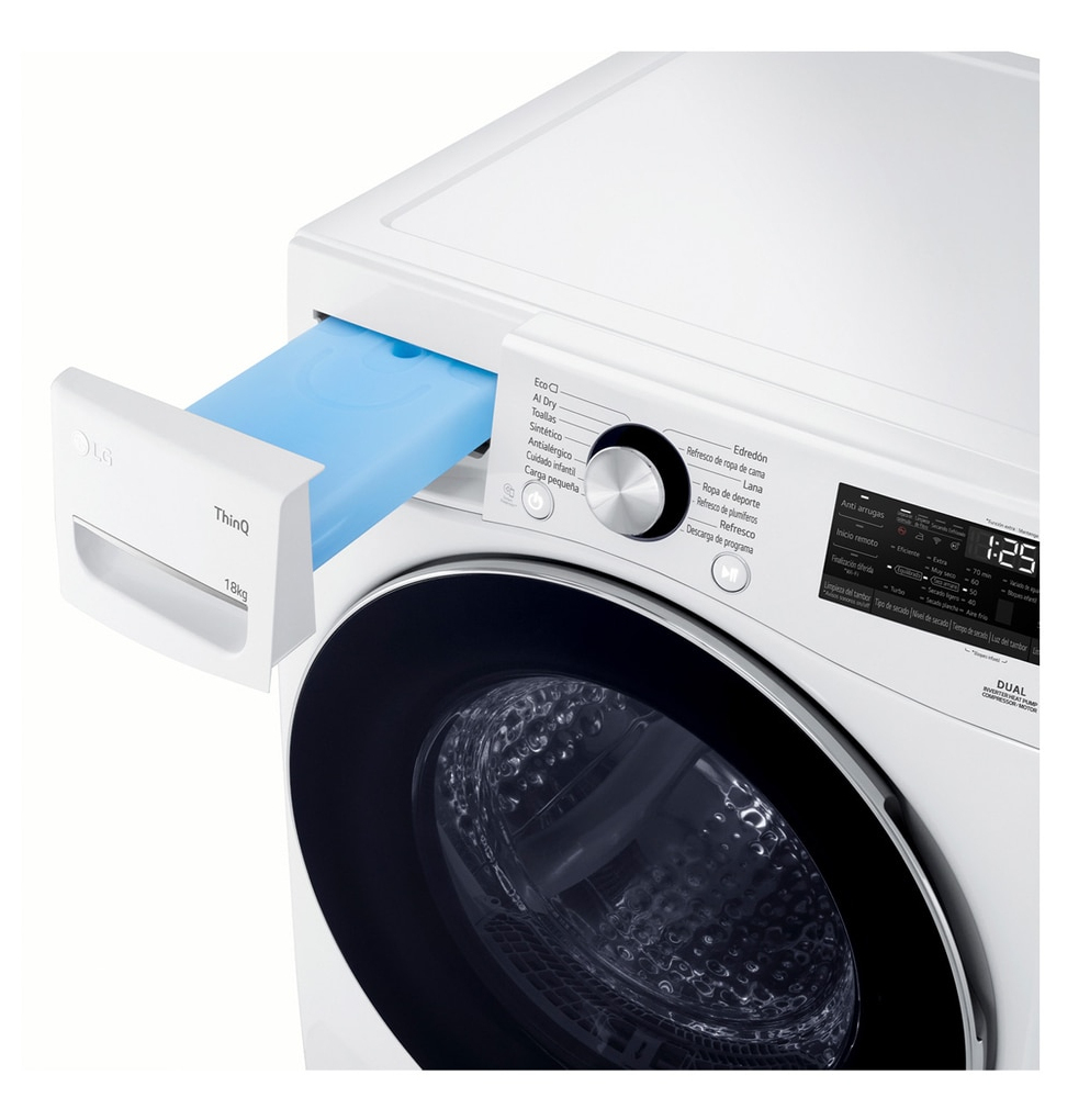 LG RH18U8AVCW. Posizionamento dell’apparecchio: Libera installazione, Tipo di carica: Caricamento frontale, Sistema di asciugatura: Pompa di calore. Capacità cestello: 18 kg, Classe di efficienza della condensazione: B, Programmi di asciugatura: Cura del bambino, Biancheria da letto, Piumino/piumone, Igiene/Allergy Care. Partenza ritardata: 19 h, Avvio ritardato (min): 3 h, Applicazioni per il controllo supportate: LG ThinQ. Classe efficienza energetica: D, Consumo energetico per 100 cicli: 178 kWh, Consumo energetico annuo: 1,78 kWh. Tecnologie LG (cura dei vestiti): Big capacity, DUAL Dry™, Inverter Direct Drive Motor