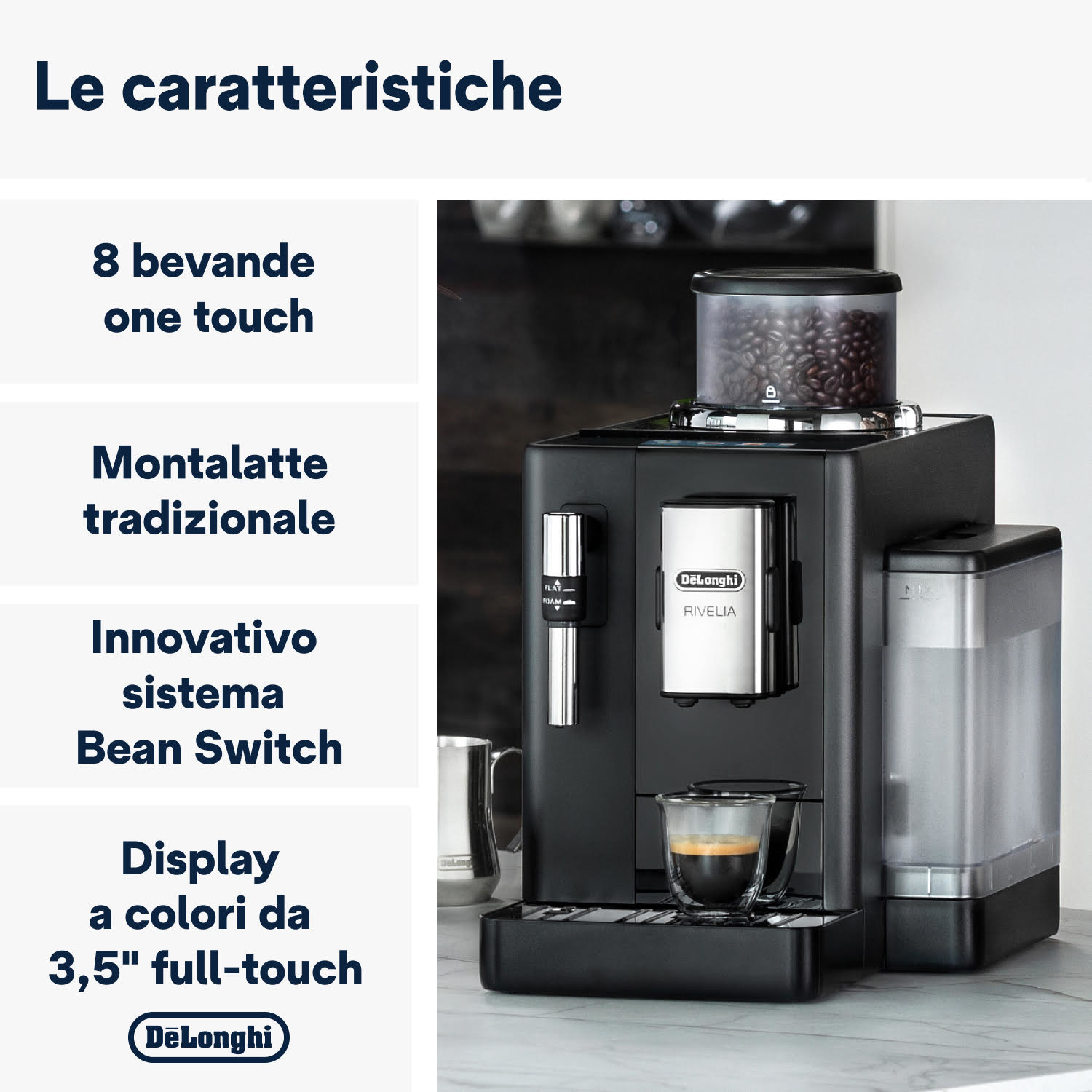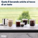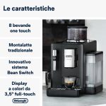 RIVELIA COFFEE. Macchina automatica per caffè in chicchi De’Longhi, Cappuccinatore manuale per una facile preparazione di una densa schiuma latte, esclusiva tecnologia “Bean Switch System” per cambiare varietà di chicchi all’istante alternando tra due diversi contenitori di chicchi da 250 gr, “Bean Adapt Technology” per regolare automaticamente il grado di temperatura e livello di aroma ottimale, 8 bevande di caffè, display a colori full-touch TFT 3,5″, 4 profili utente con funzionalità “Coffee Routines”, funzione “Extra shot” per una maggiore intensità, funzionamento con grani e con polvere, macinacaffè integrato e regolabile fino a 13 livelli di macinatura, regolazione della temperatura, della quantità di caffè e di acqua, Thermoblock, durezza dell’acqua e spegnimento automatico programmabili, pulizia automatica della caraffa latte, colore onyx black.