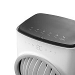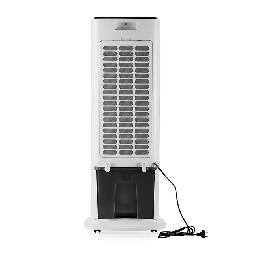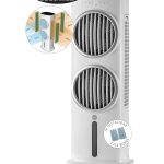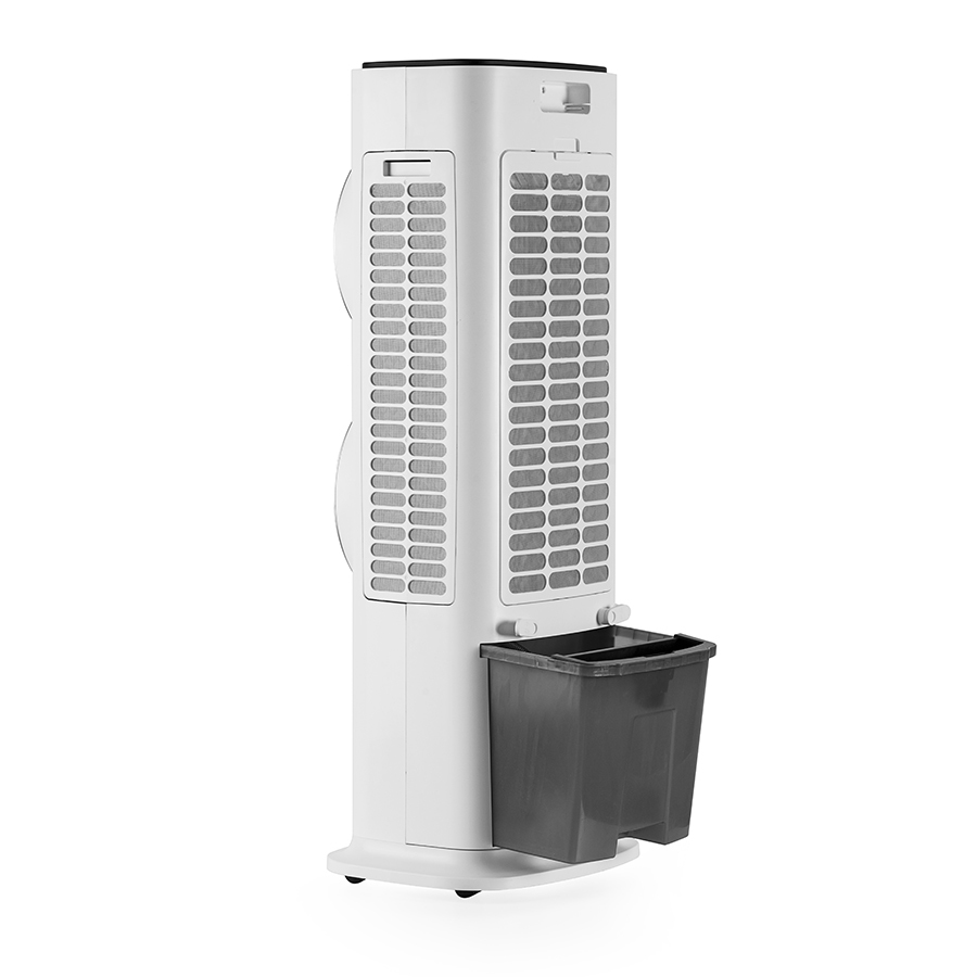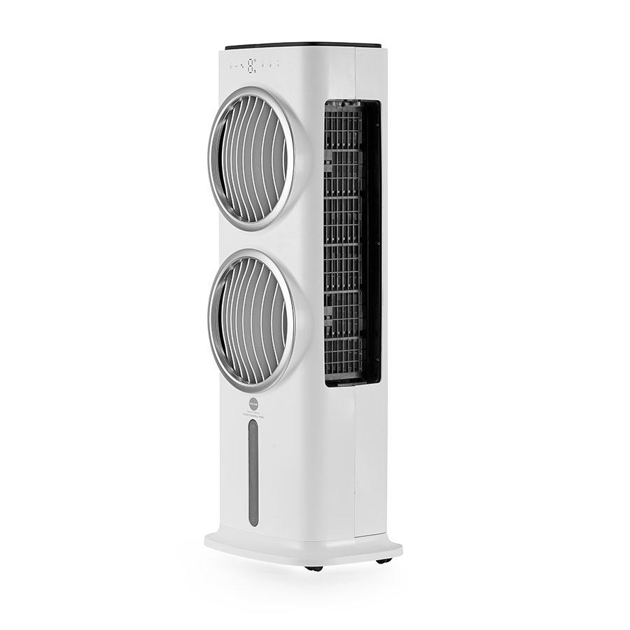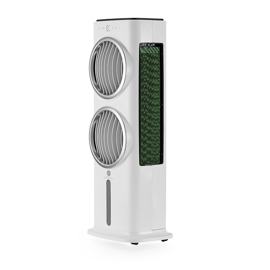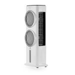 Elegante raffrescatore evaporativo ad acqua che permette di ottenere aria fresca e pulita in qualsiasi ambiente. Le alette muovendosi da sinistra a destra generano un flusso d’aria di 80° e fino a 12 metri, il doppio dei normali raffrescatori. Comandi intuitivi controllabili direttamente dal pannello touch screen, dal telecomando. Tre diverse velocità fisse e tre diversi programmi di ventilazione a flussi variabili.