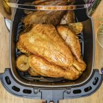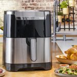 Una friggitrice ad aria e griglia in formato XXL che prepara due cibi diversi pronti contemporaneamente