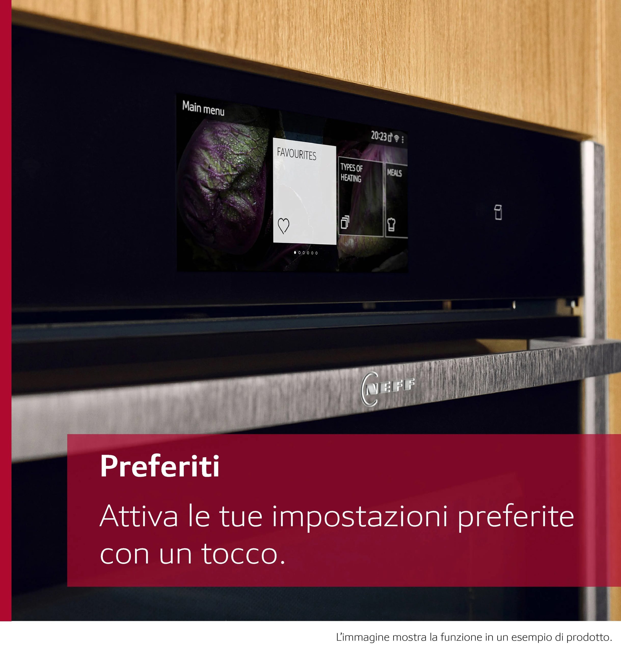 Salva le impostazioni che usi più spesso nei Preferiti e attivale con un solo tocco. Salva le modalità di riscaldamento e i programmi che utilizzi più spesso per preparare il tuo piatto preferito con il semplice tocco di un pulsante. Puoi salvare le impostazioni sull’elettrodomestico o nell’app Home Connect. Per utilizzare la funzione Preferiti, basta connettere il forno al tuo account Home Connect attivo.